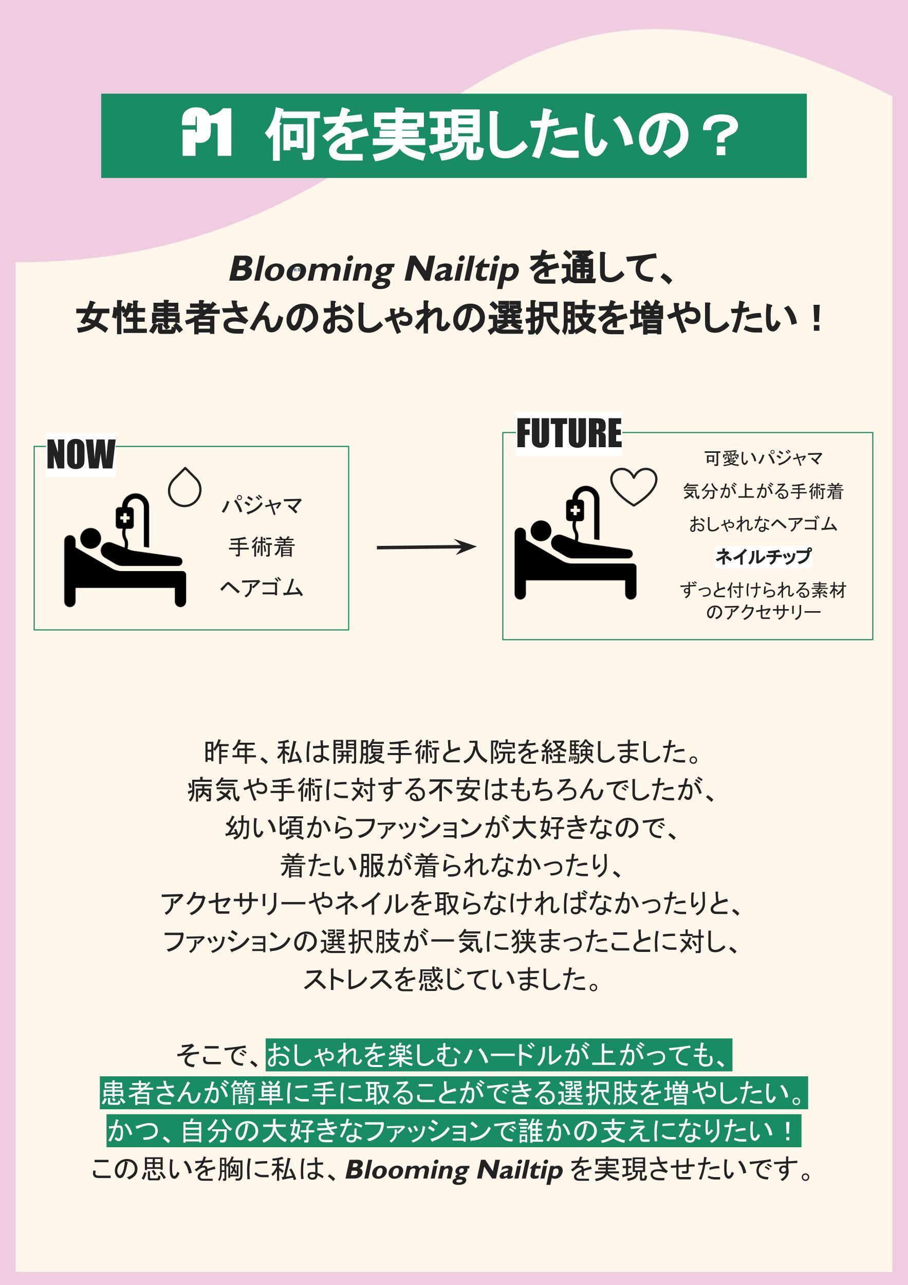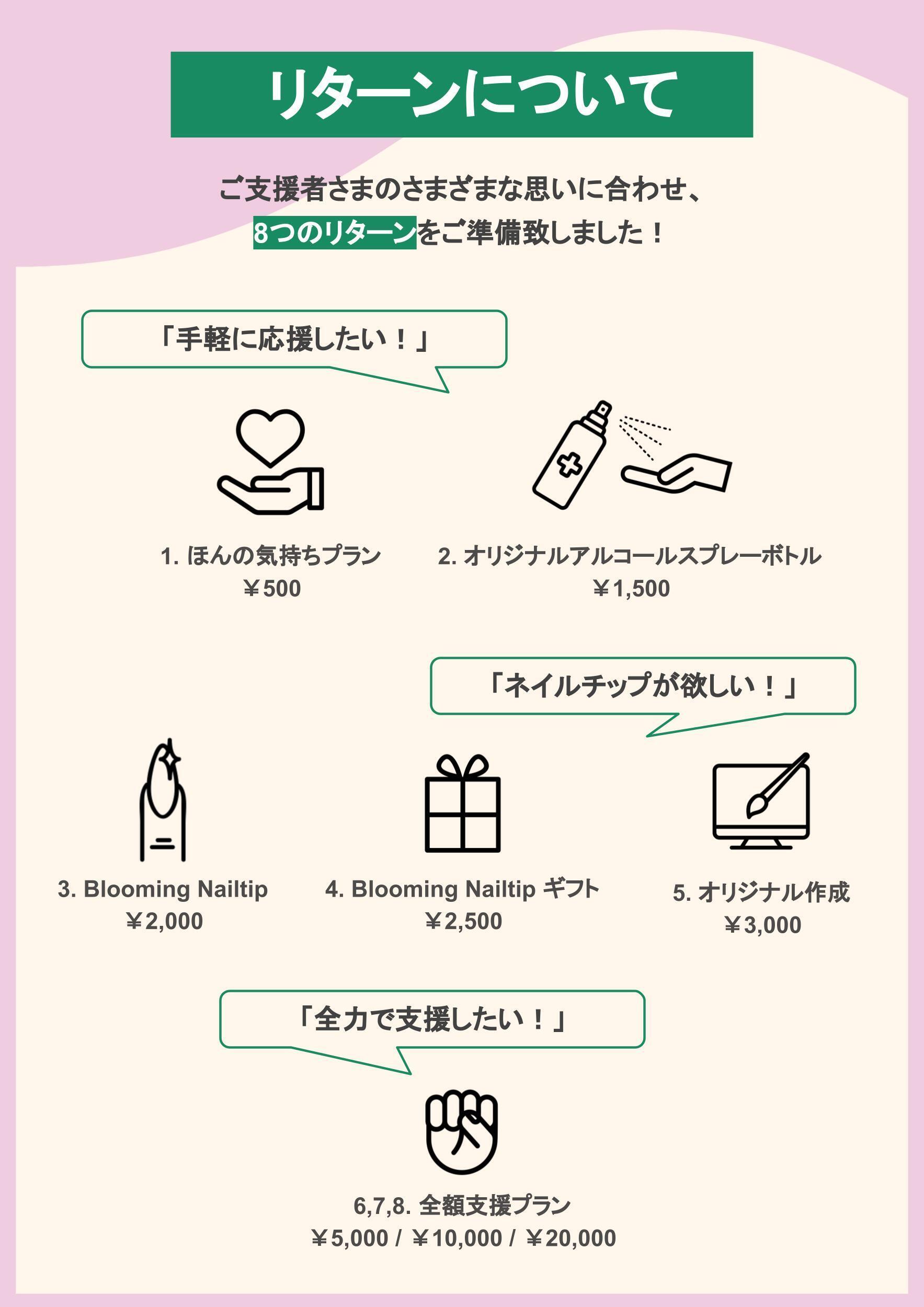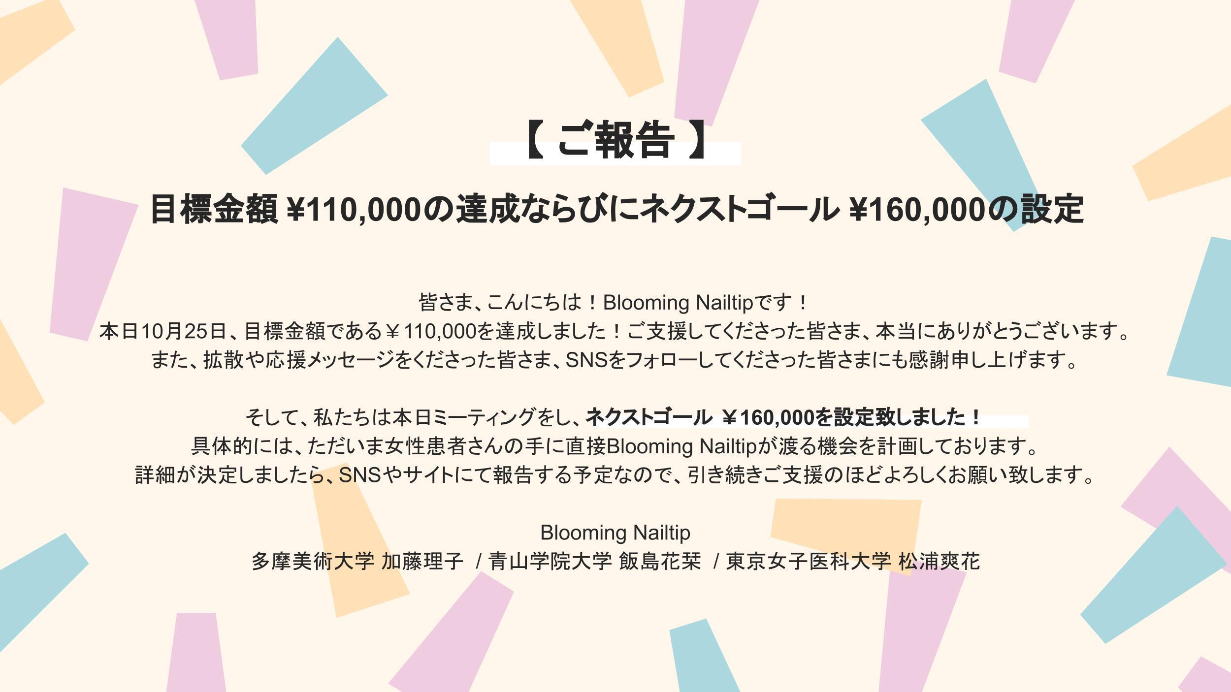 2021/10/31 10:00こんばんは!Blooming Nailtipです!初回の活動報告になりますが、なんと先日10月25日...私たちの最初の目標であった【¥110,000を達成】致しました!!クラウドファンディング開始からわずか10日での目標達成にチーム一同驚いております...!皆様のご支援やあたたかいご声援、拡散には感謝の気持ちでいっぱいです。この場を借りて改めてお礼申し上げます、有難う御座いました。皆様から頂いたご支援、お気持ちを無駄にせず、本来の目標「女性患者さんのおしゃれの選択肢を増やし、日常を彩る」に向かって確実に形にしていくため、より一層尽力して参ります。そして私たちはネクストゴールを【¥160,000】と設定致しました!ただいま女性患者さんの手に、より直接Blooming Nailtipをお届けできるような機会を計画しております。詳細が決まり次第、SNSやサイトにてご報告させて頂きますので、引き続き応援の程よろしくお願い致します!--------↓ここから未公開情報↓---------現在、全額応援プランのリターンであるオリジナルステッカーを製作中です。プロジェクトリーダー加藤が1からデザインしたとっても可愛いステッカーに仕上がっております!スマホケースに入れてもよし◎パソコンに貼っていただいてもよし◎↑今回はそのステッカーをご支援頂いた方限定でちょい見せしちゃいます!!:)ステッカー(全額応援プランリターン)のお届けは12月を予定しておりますので、今しばらくお待ち下さいませ。引き続きBlooming Nailtipをよろしくお願いいたします! もっと見る