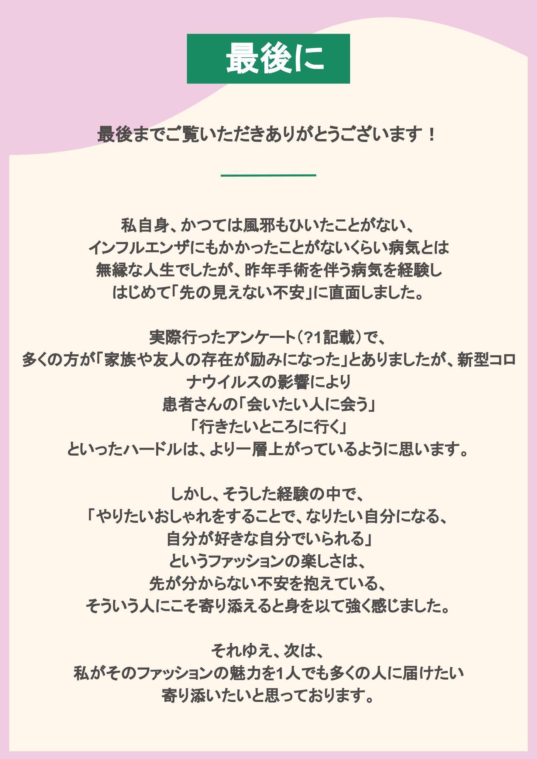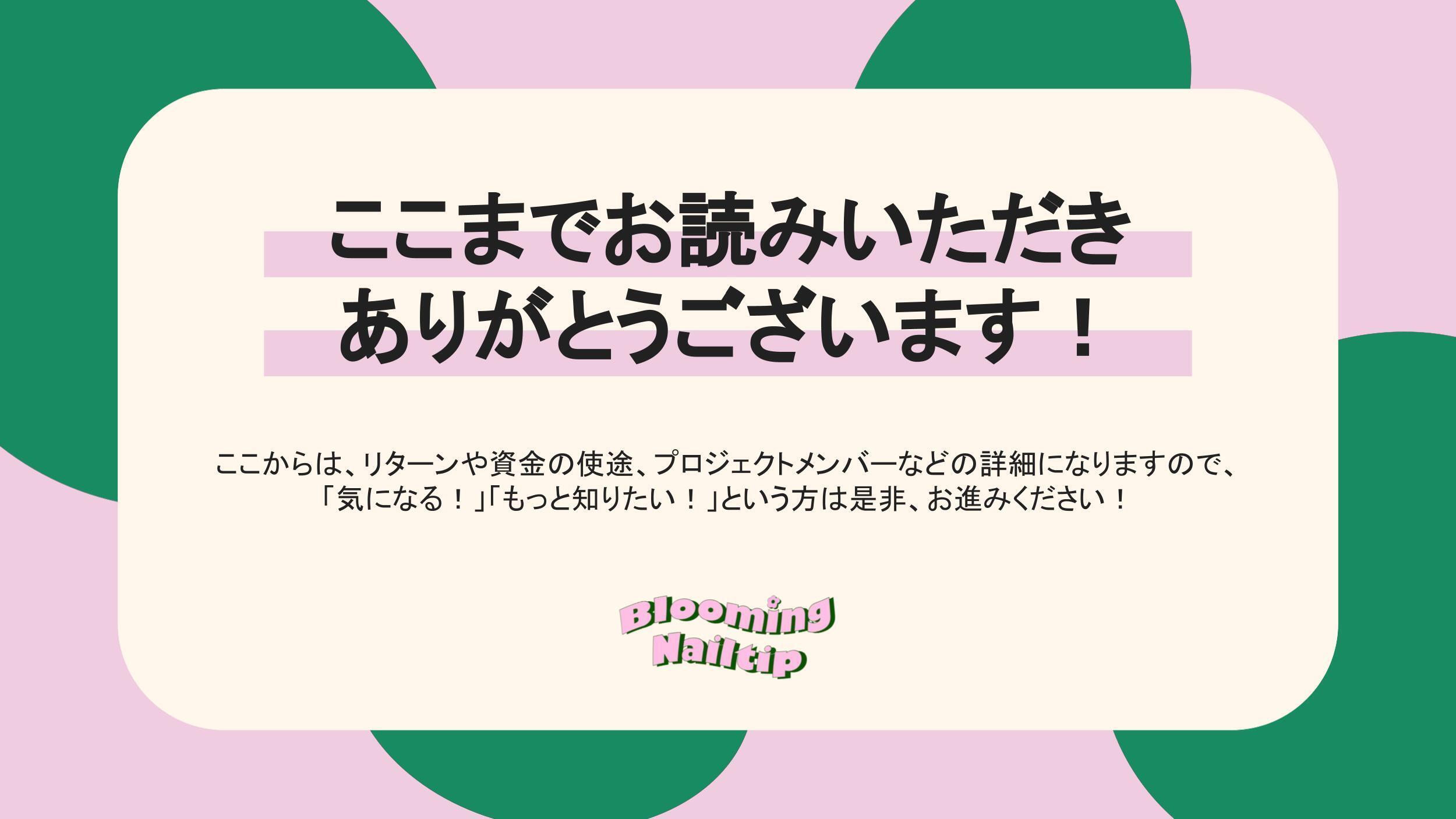 2022/01/07 13:46新年明けましておめでとうございます!Blooming Nailtipです。Instagramでご挨拶をさせていただいたきり、こちらの更新をすっかりと逃していました…申し訳ございません!本日は、12月の動きと今後の予定につきまして記載させていただきます :)最後に、メンバーひとりひとりのメッセージも残しておりますので、もしよろしければご覧ください!【 12月の動き 】リターンの準備を遂行して参りました!残すは発送のみ :)1月中旬〜下旬には皆さま元にお届け致しますので、今しばらくお待ちください!NEXTGOALを達成したため、発送が必要なご支援者さまひとりひとりに手書きのメッセージカードをご用意させていただきました!腱鞘炎になるのではないかと思うくらい(笑)メンバー全員で心を込め書かせていただきました!【 メッセージ 】皆さまのご支援とご協力により、目標金額ならびにNEXT GOALを達成できましたことをご報告いたします。「日々の生活の中で、おしゃれを通してちょっとした幸せを感じて欲しい」「新型コロナウイルスの影響で外出や人に会うハードルがより上がっているからこそ、パワーストーンを通じて繋がりを感じて欲しい」このプロジェクトは、自身の体験を踏まえ、女性患者さまをターゲットにしたコンテンツとして企画して参りました。上述したことはもちろんですが、私自身、プロジェクトの発信を通して同世代の女性に検診に行くきっかけや誰でも病気になり得ること、そして私のプロジェクトに対する思いに共感していただけたことがすごく嬉しかったと共に、いわゆる「もの」だけを通してではなく、支援者さま、ご協力者さまと「心」を通わせられたのではないかと、プロジェクト遂行の本質が見えたような気がしています。これから皆さまにリターンとしてひとつひとつ丁寧にお返しして参ります。病気ではなくても、Blooming Nailtipを通じておしゃれを楽しんだり、何かパワーを感じていただいたり、またはお守りとして身につけていただいたりなど、皆さまの日々に彩りをもたらすことができればとても幸せです。この度は本当にありがとうございました!加藤 理子ーーーーーーーーこの度、10/15~スタートしたblooming nailtipのクラウドファンディングが終了致しました。ご支援してくださった方々、興味を持ってくださった方々、本当にありがとうございます。病気だから。と心が沈んでいる方でも、blooming nailtipを通して、少しでも元気になるきっかけとなれば嬉しいです。改めて、ご協力頂いた皆様に、厚く御礼申し上げます。サポートメンバー 松浦爽花ーーーーーーーーおかげさまで目標金額¥110,000、NEXTGOAL¥160,000を達成することができました!まずは私達の想いにご賛同頂きご支援して下さった方々、本当に有難う御座います。皆様の想いも乗せて、ネイルチップを通じポジティブな気持ちを届けます!そして拡散して下さった方々、あたたかいご声援を下さった方々にも重ねて御礼申し上げます。多くの方々に支えて頂き、ひとまずクラウドファンディングというステップでは目標達成できたこのプロジェクトですが、ここからが本番です!今一度気を引き締めて最後までやりきりますので、見届けて頂けたら嬉しいです。サポートメンバー 飯島花栞 もっと見る11月の活動