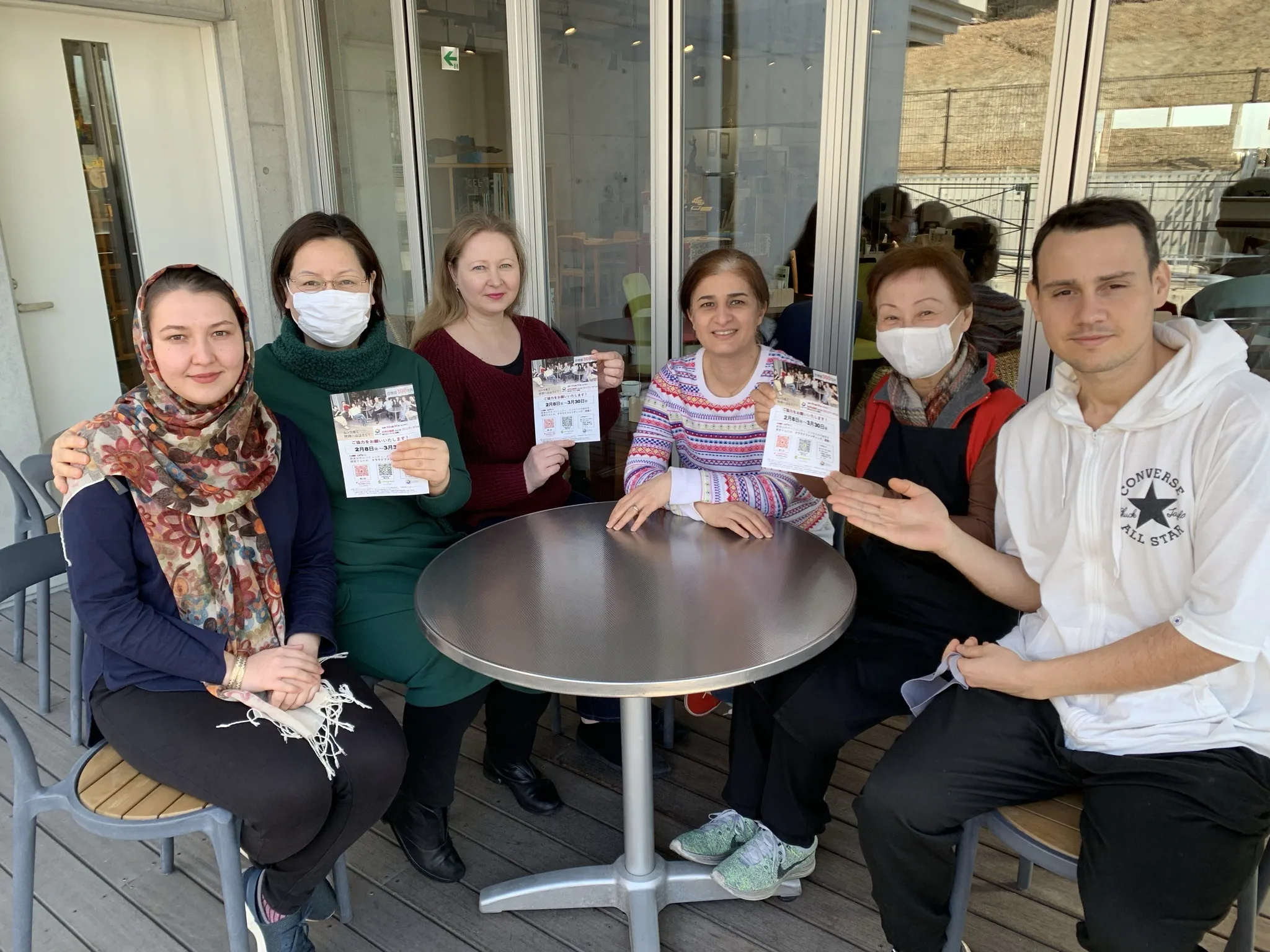 今日のランチのシェフ、アスィエさんと、アイリンさん(ともにイラン出身)、スタッフのフランクリンさん(キューバ)、崔さん(韓国)、ナタリアさん(ロシア)、エネビシさん(モンゴル)より、今日の料理の説明と、プロジェクトのご支援への呼びかけです。
