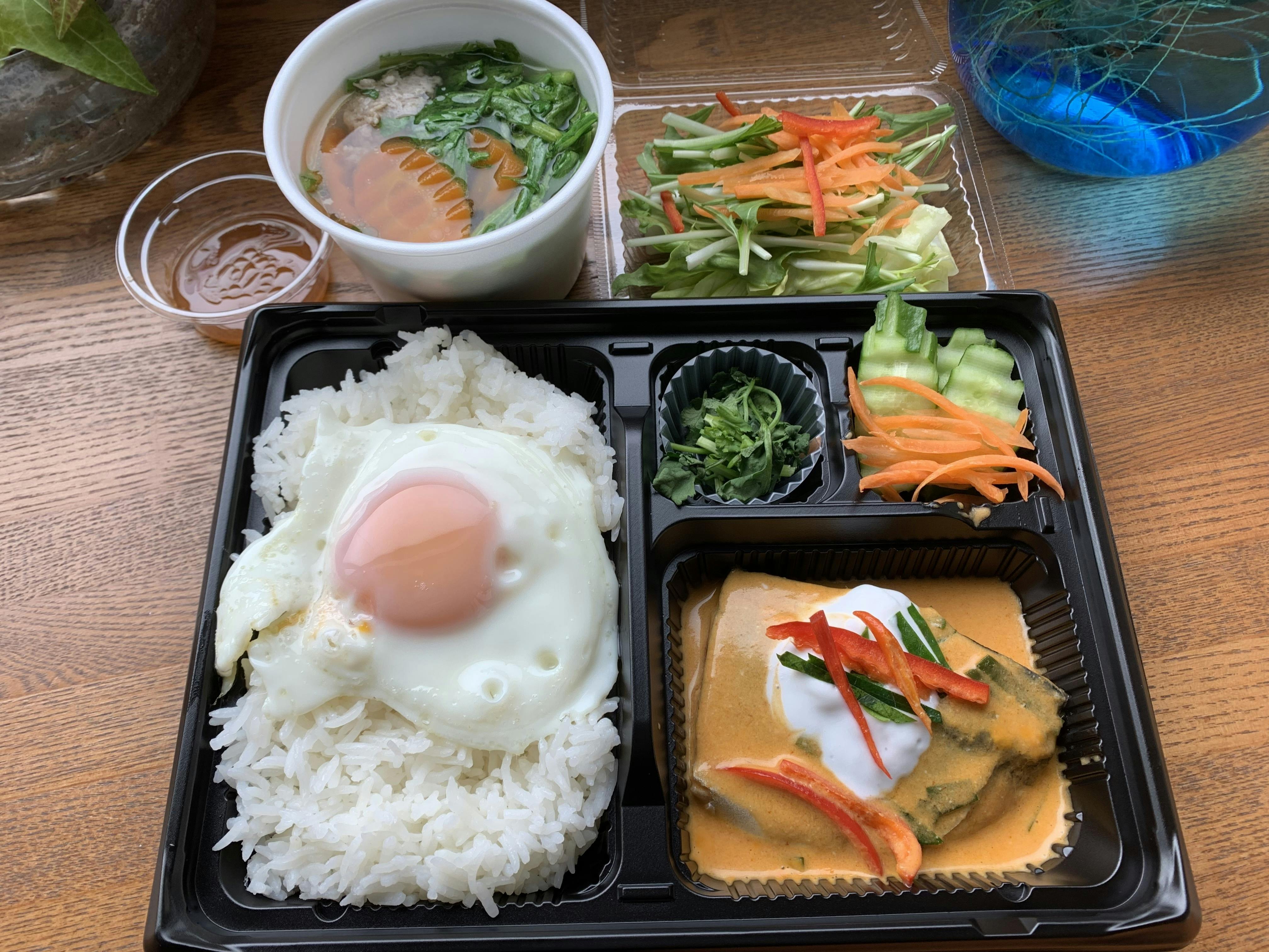 スープは春菊と肉団子の中華風スープ。タイではポピュラーだそうですが、華人のノックさんならではの、タイと中国の食文化が見事に融合したメニューでした。