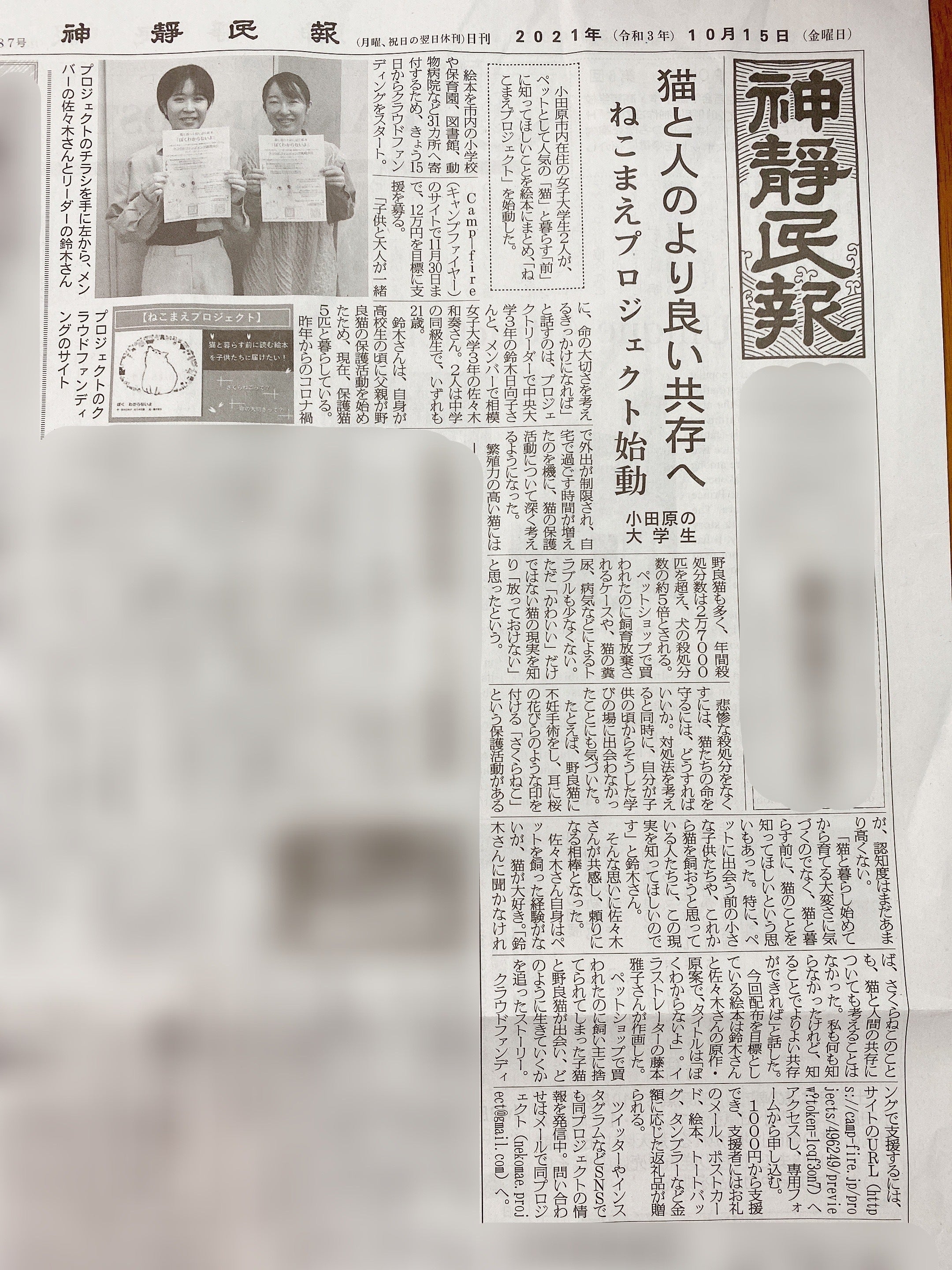 10月15日、クラウドファンディング開始日に、日刊神静民報さまに記事にしていただきました!