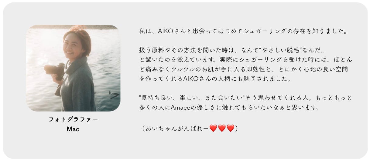 今までは個人で小さくシュガーリングを提供しておりましたが、Amaeeでより多くの人にシュガーリングを体験してもらいたいと思い、仲間と共にサロンとして再スタートを切ることにしました!