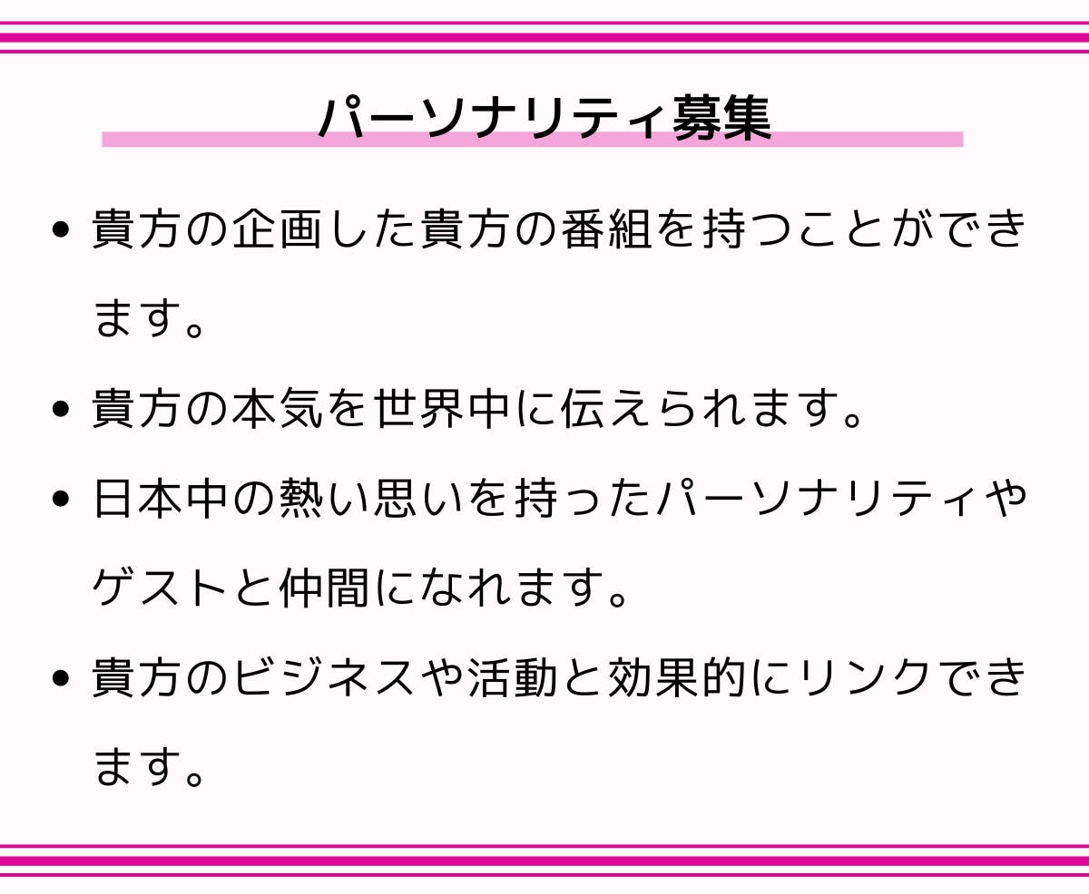 ・50000円:10分番組プチパーソナリティ体験3ヶ月+ちよ媛webサイト新企画コーナー掲載(写真+自己PR音声)12ヶ月