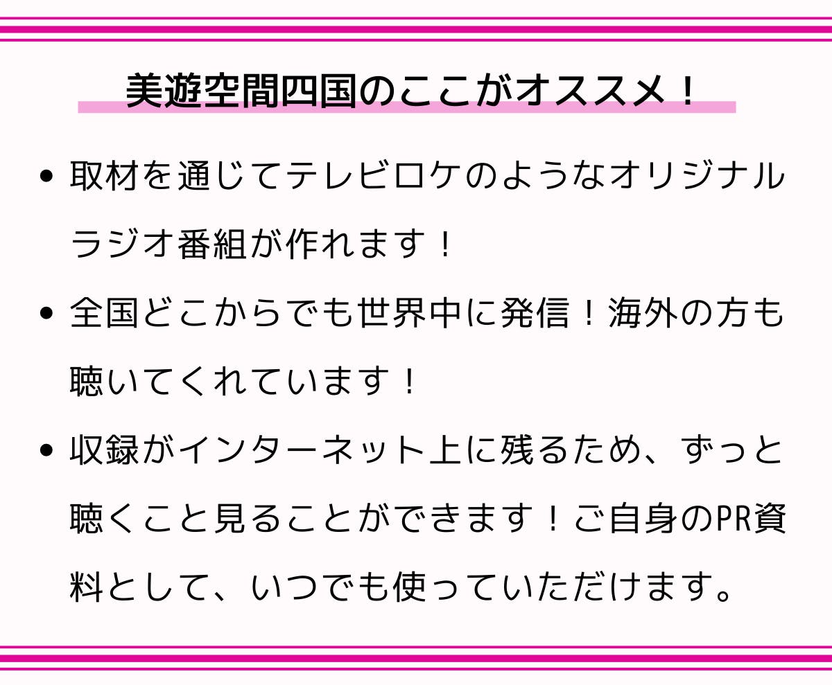現在30番組でプチパーソナリティの皆様とご一緒させていただいております。「美遊空間四国のラジオを聴いてもらってお店に取材が入ったよ!」というゲストさんもおられ、そう言った声をいただけることが本当に嬉しいです!