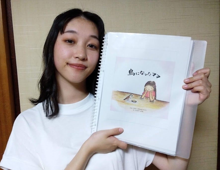 13年前、7歳の時に母を卵巣がんで亡くし、その時に起きた不思議な出来事を忘れずに残しておこうと、祖父と一緒に手作り絵本「鳥になったママ」を作りました。