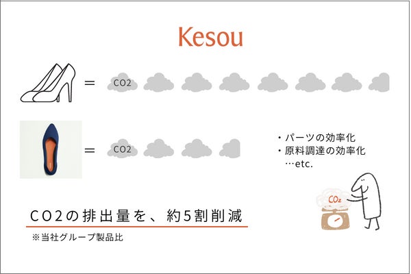 また、素材の種類やパーツの数を従来のパンプスよりも効率化していることで、原材料の輸送等で発生するCO2を削減しています。
