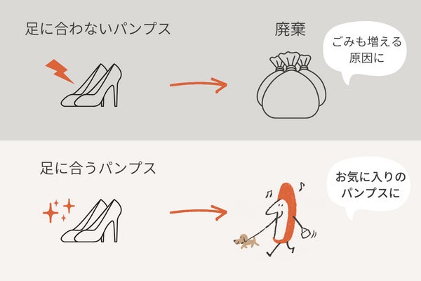 足に合わないパンプスで痛い思いをし、結局捨てることになってしまうと、廃棄が増えることにもつながります。