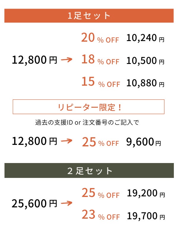 リピーターさま限定のリターンもご用意しておりますので、2足目が気になる方はぜひご利用ください。