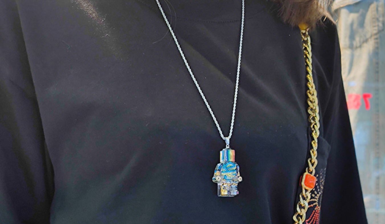 商品のお名前はまだ決めていないので、暫定的にロボットペンダントと呼びましょう。手作業で樹脂のロボットに半導体部品を入れ込んで、すごくかっこいい一品です。ネックレスとしても美しく、唯一無二の存在です。次回クラウドファンディング前に試作品をプレゼントさせていただきます。下記写真はサイズ感を示しているだけで、実際プレゼントする商品とは異なります。