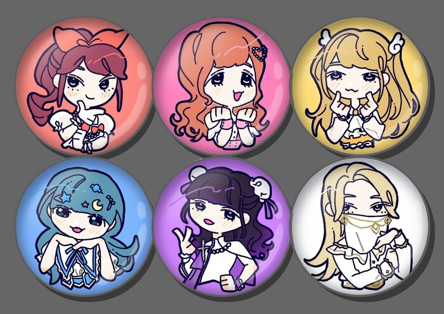 メンバーのイラストが描かれた缶バッジ6個セットをお届け