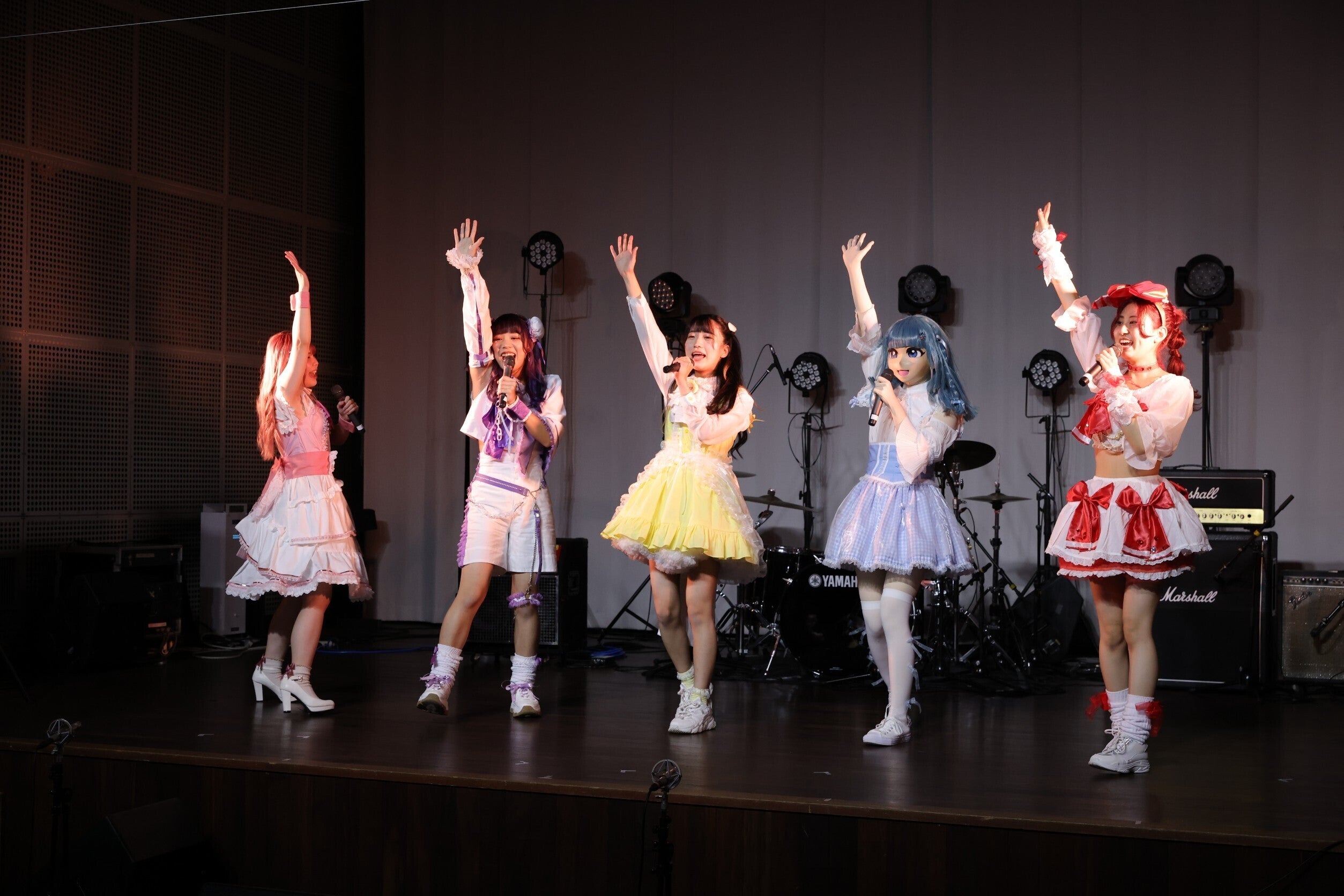 私達は赤色担当兼プロデューサー・姫宮みあを中心に音楽、振り付け、衣装、映像すべてを美大生が手掛けているセルフプロデュースアイドルです!