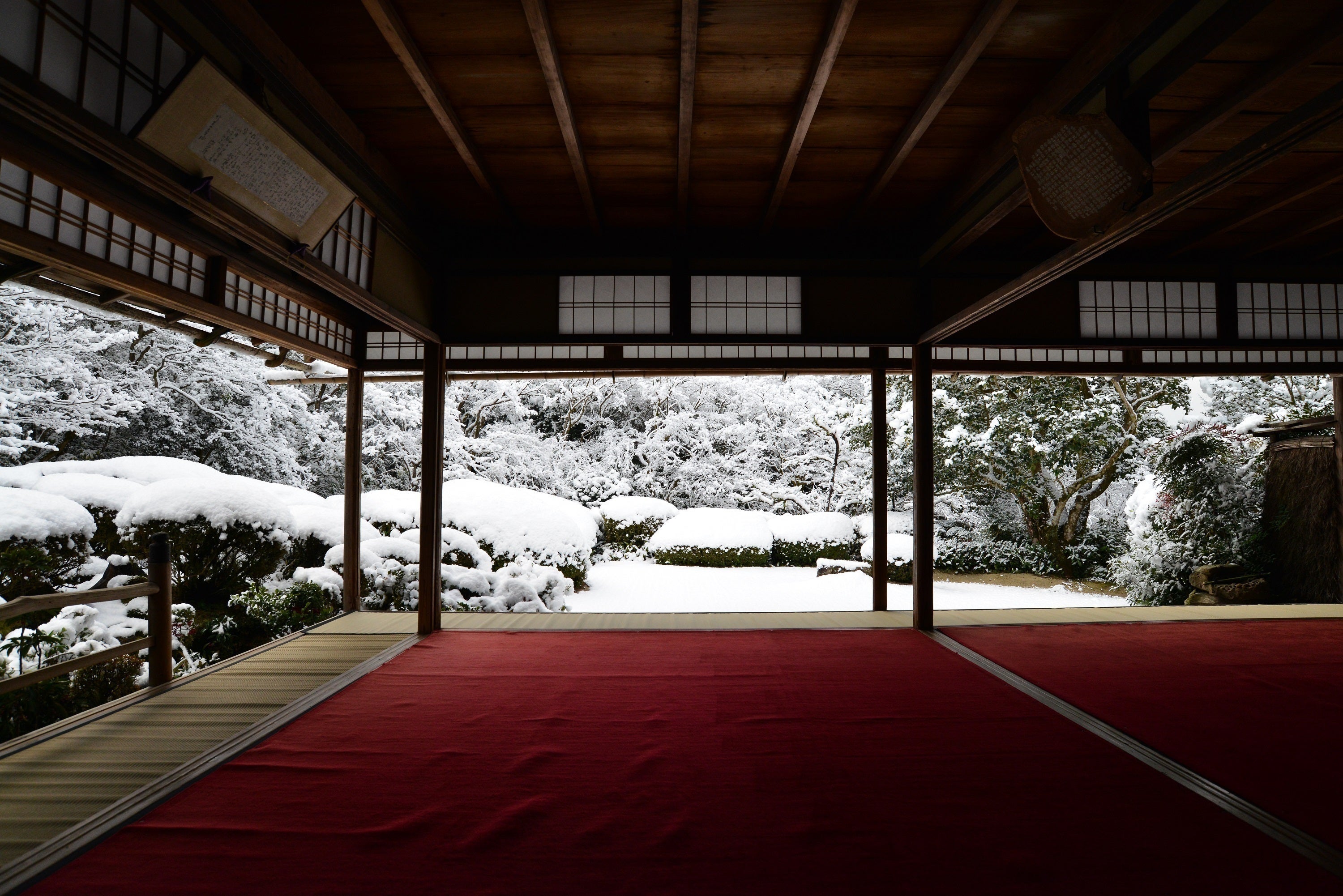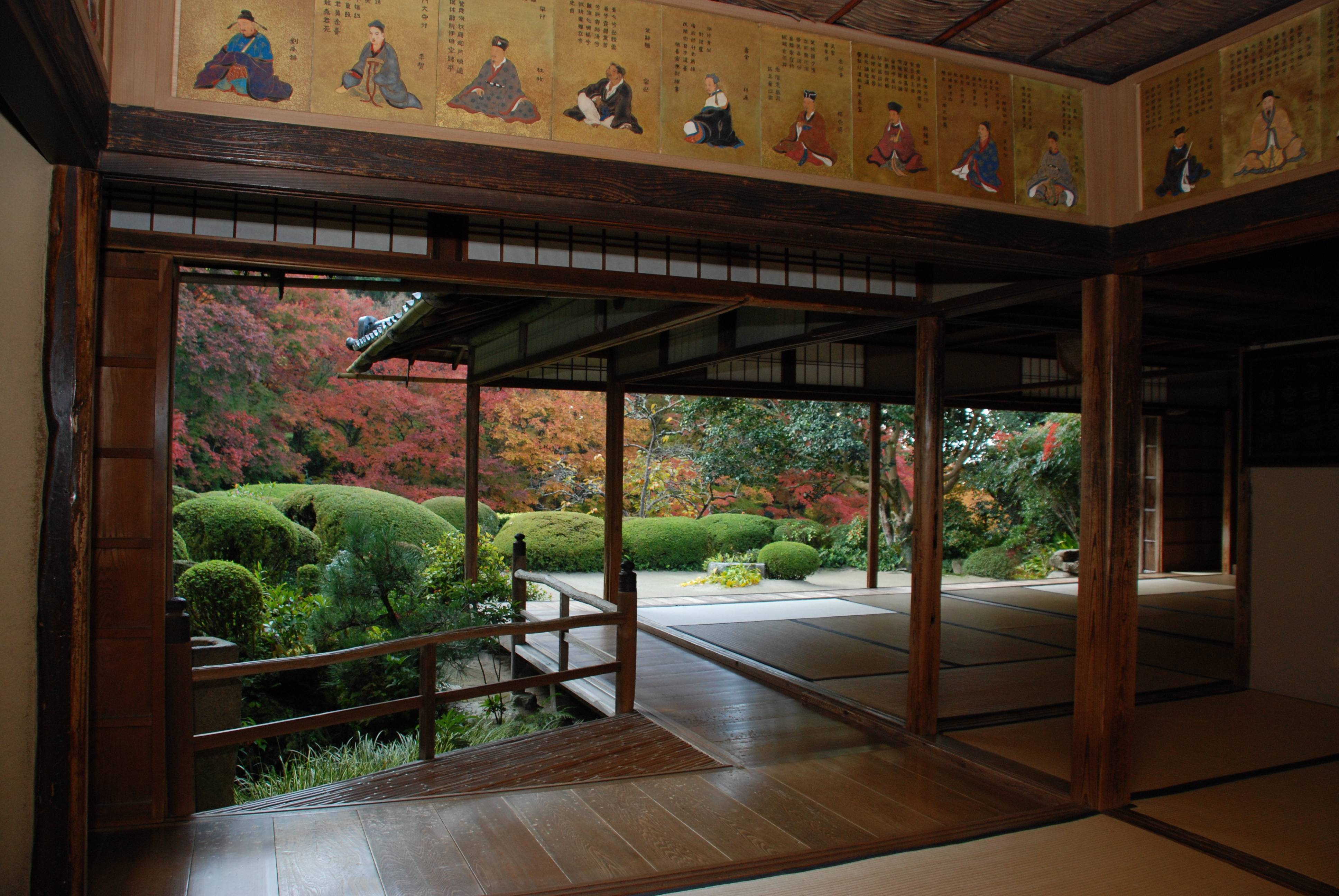 「詩仙堂」の名の由来は、中国の漢・晋・唐・宋の詩家36人(杜甫・李白・孟浩然・王維等)の肖像を狩野探幽に描かせ、図上にそれぞれの詩人の詩を丈山翁が自ら隷書体で書いて部屋の四方に掲げた「詩仙の間」中心とするところから通称「詩仙堂」と呼ばれています。