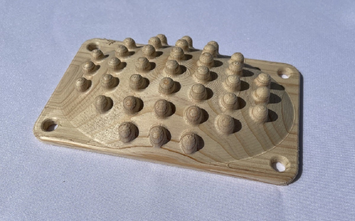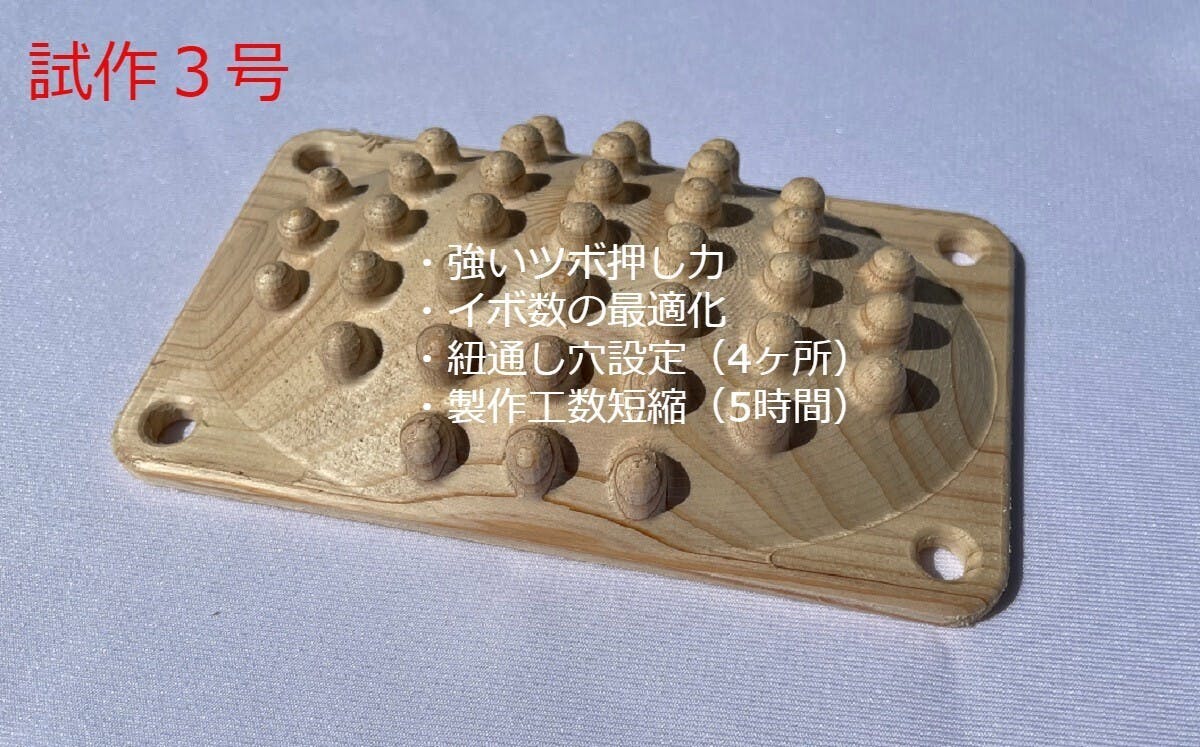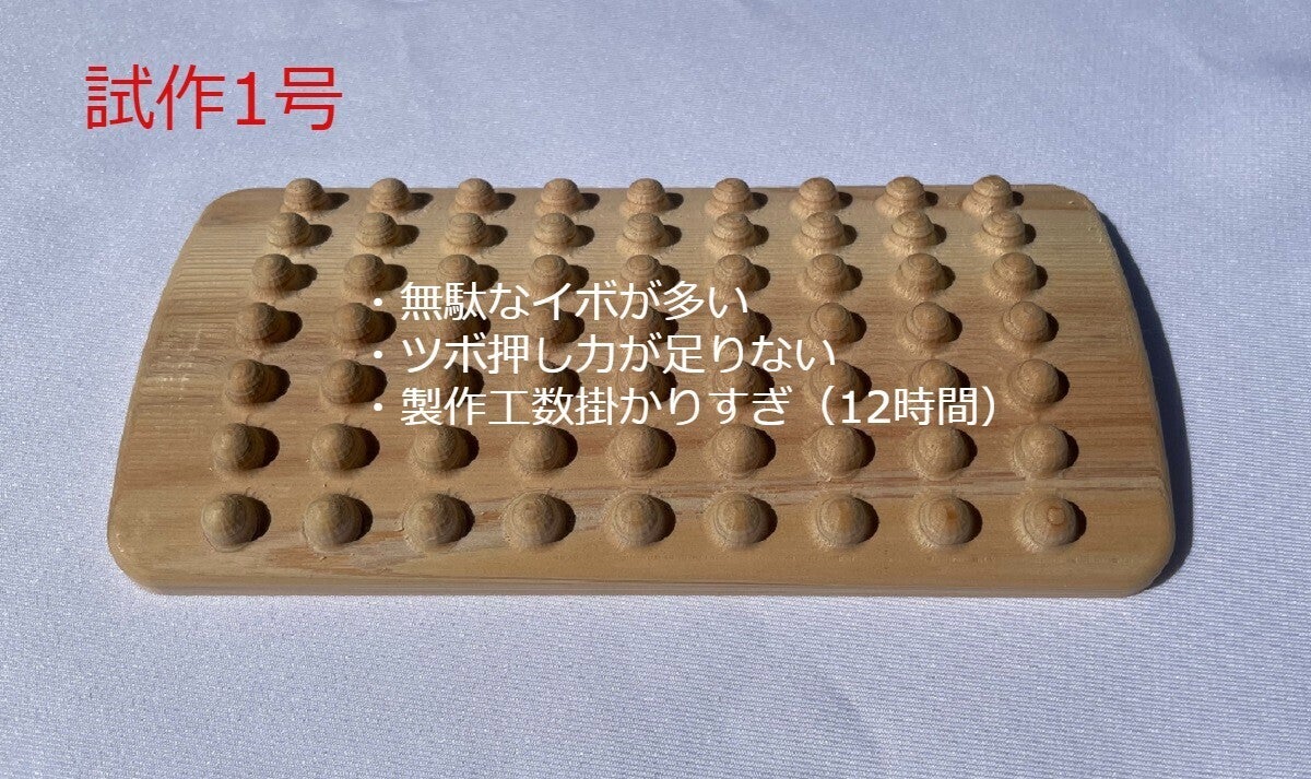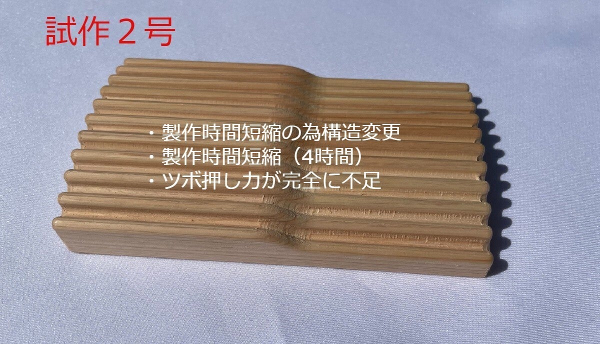 足つぼマッサージ 『極ツボ』 桧(ヒノキ)材 は、知り合いからのリクエストにより開発されました。最近のテレワーク対応などによる、疲労が蓄積するなかで、座ったままでも足ツボマッサージに対応できる仕様で、高低差を多め・コンパクトな大きさ・紐を通して手で引っ張れる・長く使用できる様に丈夫な作り(一品一品削り出し)・環境にやさしい木材の使用などを、織り込んだ仕様となっております。