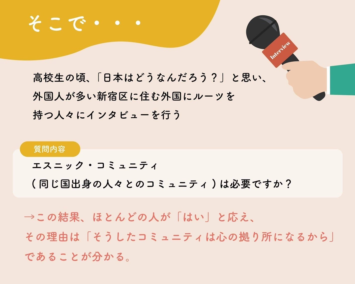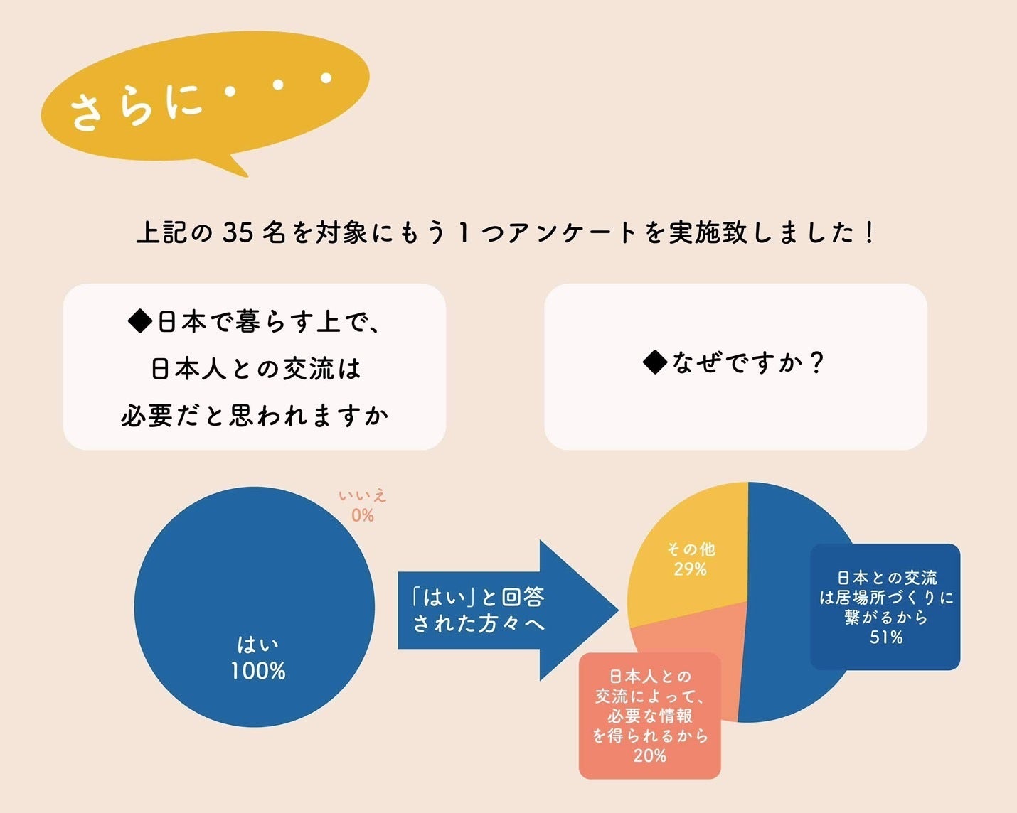 この2つ目のアンケートからは、日本における外国にルーツを持つ子どもたちの約2人に1人は孤独を感じており、こうした子どもたちにとって日本人との交流は居場所作りのために必要であることが確認できました。