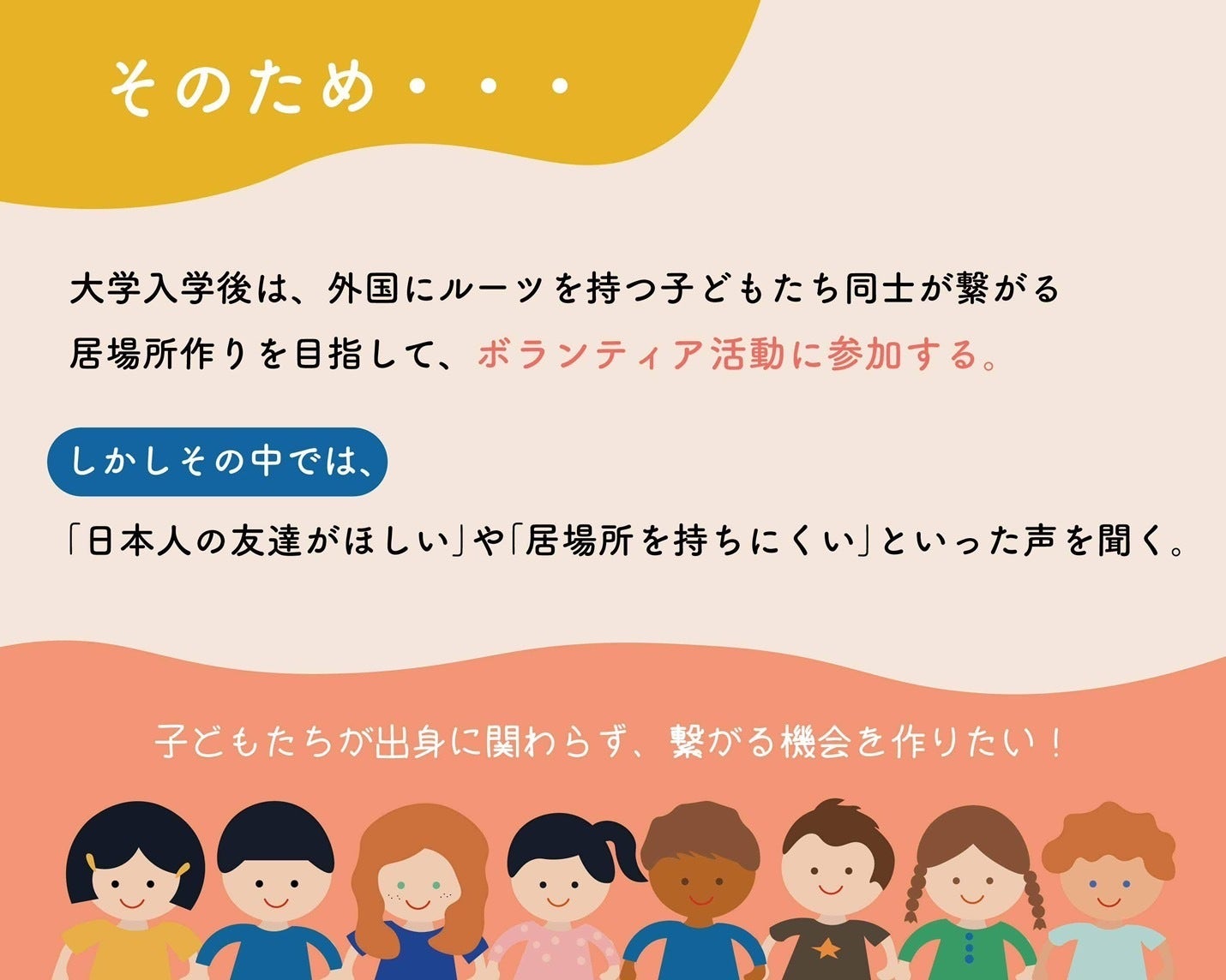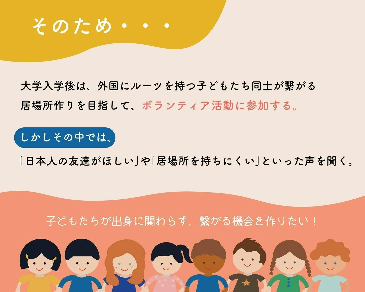 実際に、代表の中尾はこれまでボランティア活動を中心として様々な外国にルーツを持つ子どもたちと交流する中で、「自分のルーツによって居場所を持ちにくい」といった声を頻繁に耳にしてきました。