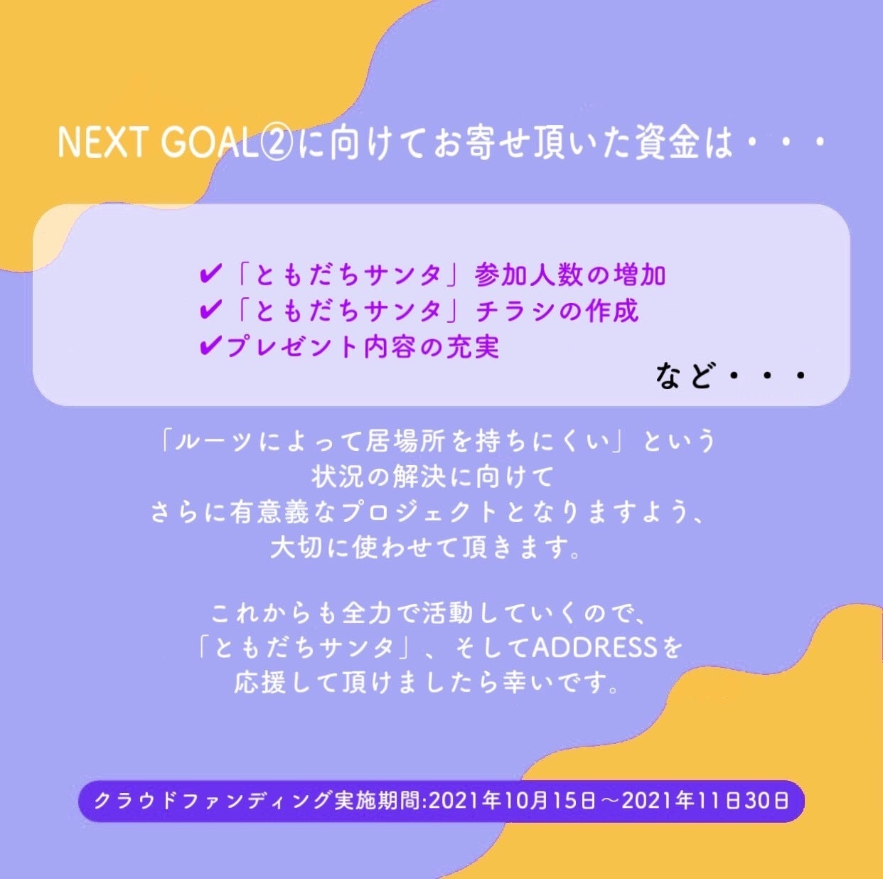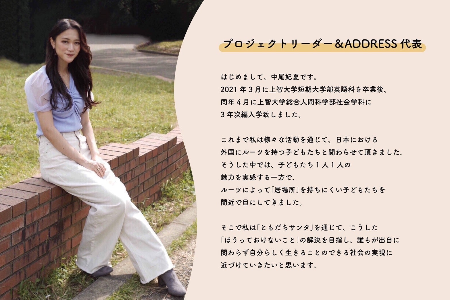 私たちADDRESSは、今回「ともだちサンタ」というプロジェクトを通じて子どもたちがルーツに関わらず「居場所」を持つことができる機会を作りたいと考えております。具体的なプロジェクトの内容は後ほどご紹介させて頂きます!!