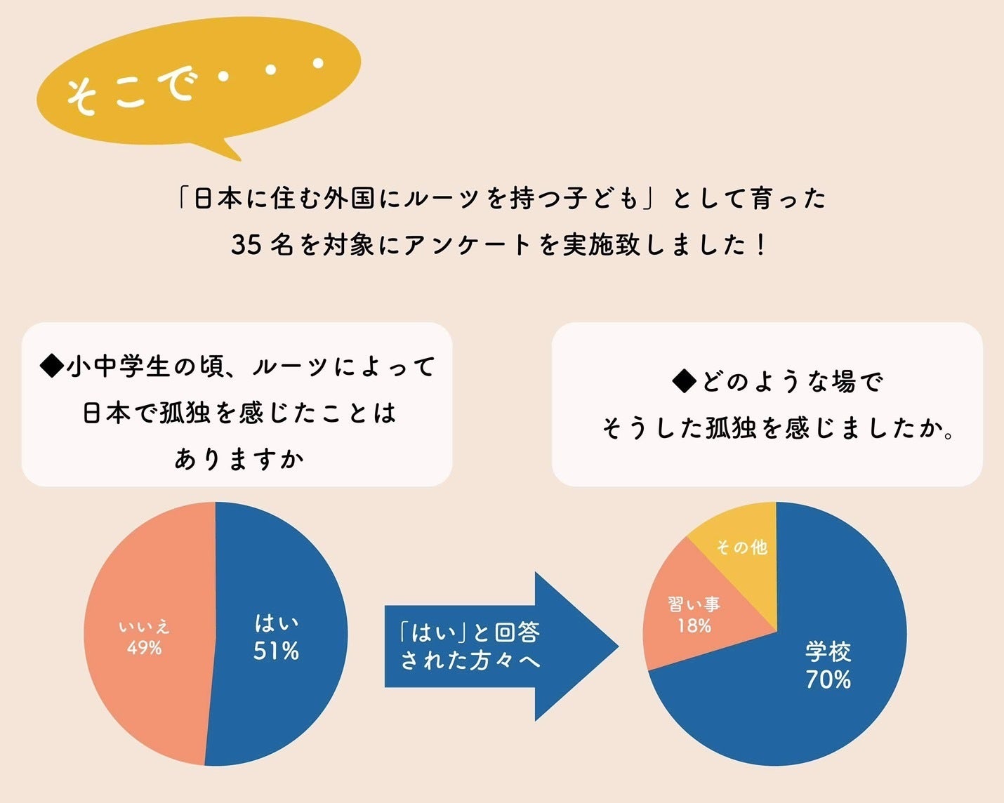 このアンケートからは、ルーツによって日本で孤独を感じている外国にルーツを持つ子どもたちは全体の半数以上を占め、こうした子どもたちのほとんどは「学校」や「習い事」などの同世代の子どもたちが集まる機会の多い場において、居場所を持ちにくいということが分かりました。