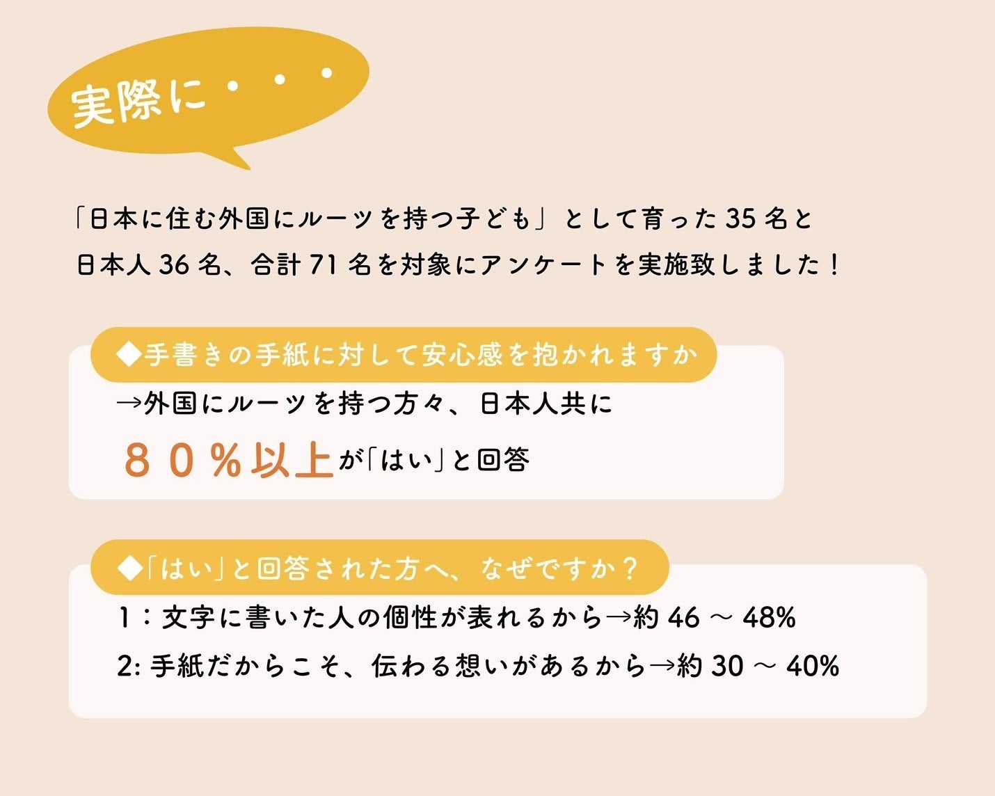 上記のような結果からも、出自に関わらず多くの方々にとって「手書き」の手紙は安心感があり、その理由のほとんどは「文字に書いた人の個性が表れること」や「手紙だからこそ、伝わる想いがあること」であることが分かりました。