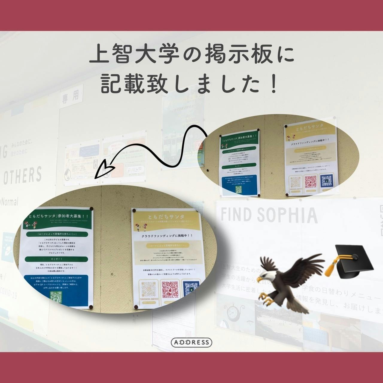 先日、上智大学四谷キャンパス内に「ともだちサンタ」のチラシを掲示させて頂きました!!