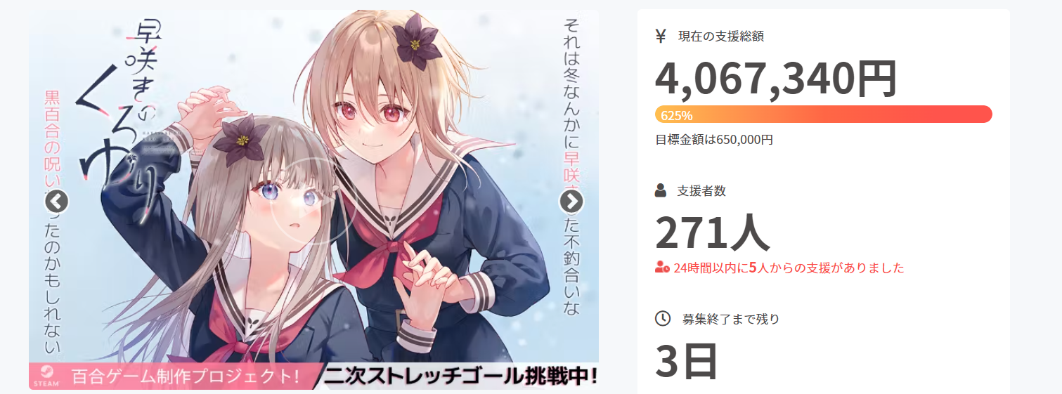 1000-REKAの河田です。クラウドファンディング終了まで残り三日ですが、嬉しいお知らせがありご報告させて頂きます!■サウンドトラックにOP(透明な萌芽)とED(タイトル未定)を追加できました!「早咲きのくろゆりサウンドトラック」に本作のオープニング曲「透明な萌芽 」とエンディング曲のフルバージョンを追加できることになりました!!該当コースは【吹奏楽部&文芸部のRead&Listenセット】【卒業生限定デジタルフォトアルバムセット】 【生徒会特権!選べる額装入り応援セット】【"生徒会長専用"応援セット】【"首席生徒専用"プレミアム応援セット】になります。水湊いづき様サイドの努力とご厚意で夢のようなことができ大変うれしく思います!本当にありがとうございました!その水湊いづき様ですが、4月23日(土)にてワンマンライブ開催とのことです!私も別のライブに伺ったことがあるのですが、本作のOP曲以外にもとても素晴らしい楽曲が数多くあるので、興味のある方は是非…!https://twitter.com/izuki_minato0/status/1499723523442774018■ストレッチゴールについて下記内容のストレッチゴールが無事到達致しました!・ご支援額500%超え(325万円)で青×藍の缶バッチをご支援様全員に返礼!・ご支援者数250人で全員に缶バッチの返礼!正直ここまでご支援頂けるとは始める前は思っておらず、ただただ感謝の気持ちしかございません…! 引き続きご期待に沿える作品を作っていきたいと思います。