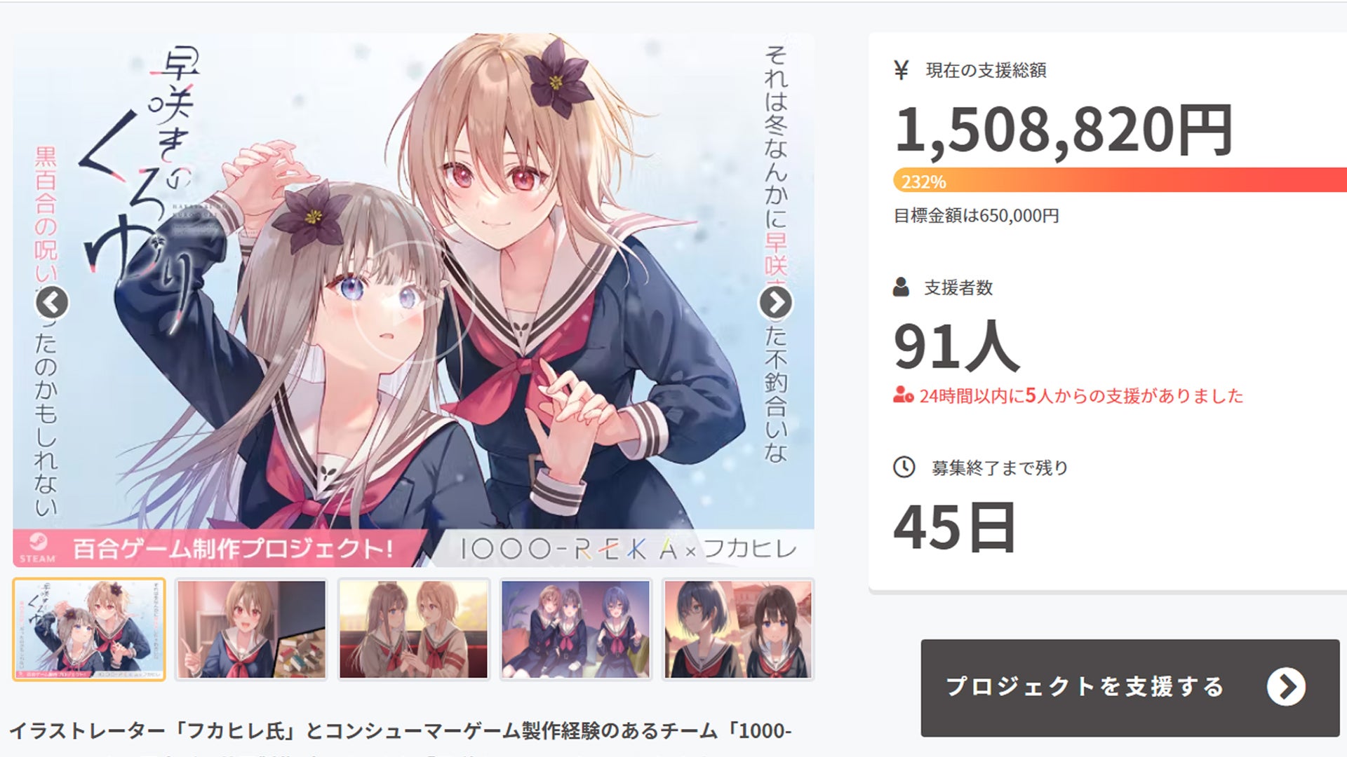 [本作の一部背景は雰囲気に合わせてアニメーションします!]1000-REKAの河田です。第一次ストレッチゴール無事到達致しました!ここまで皆さまにご支援・応援頂き、感謝しかありません!引き続きご期待に沿える作品を作っていきたいと思います。ストレッチゴール到達に伴い、下記の内容を追加しました。■第二次ストレッチゴールの設定①ご支援額500%超え(325万円)で青×藍の缶バッチをご支援様全員に返礼!引き続きストレッチゴールで行う「ご支援者数250人で全員に缶バッチの返礼!(花×樹)」の対となるような缶バッチになります!②ご支援額700%超え(455万円)で特製カトラリー&それにまつわるシチュエーションイベント「樹ちゃんのお弁当」の制作!実際のグッズとストーリーが連動する「樹ちゃんのお弁当」イベントを制作します!もちろんイベントのDLCも、実際のカトラリーグッズも"支援者様全員に返礼"!上記すべてご支援頂いた皆さまに行き渡る内容です!改めて、この度はご支援ありがとうございます!引き続き楽しんで頂く情報を更新していくため、応援頂けますと幸いです!