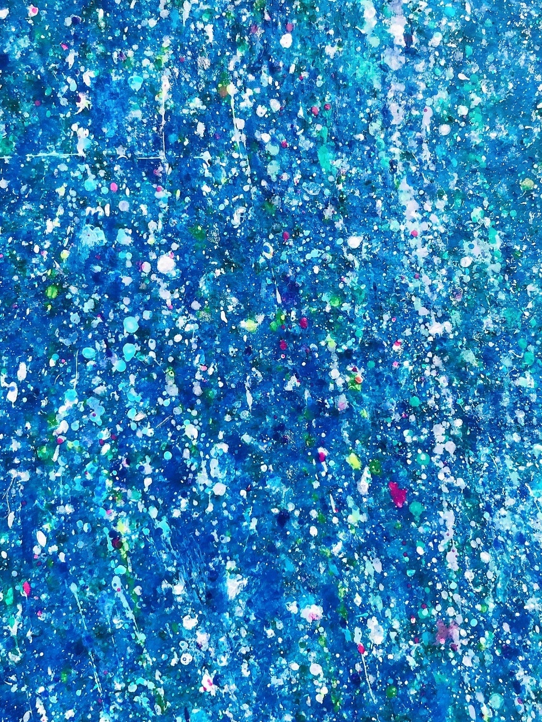 絵の具を指先や筆で飛ばして色を幾重にも重ねてゆく