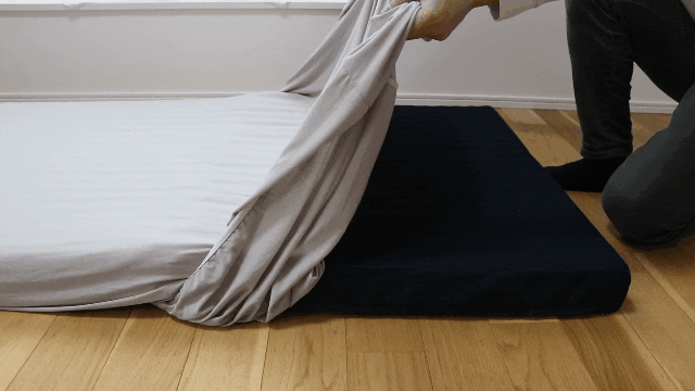 ボックスシーツはゴム付きでDenim Mofaの上から、さっと被せるだけで装着できます。