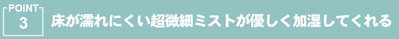 お肌や喉などに優しい超微細なミストが心地よく、床や加湿器の周囲が濡れにくいので快適にお使いいただけます。また、クールミストなので小さなお子様やペットがいるご家庭でも安心してご使用ただけます。