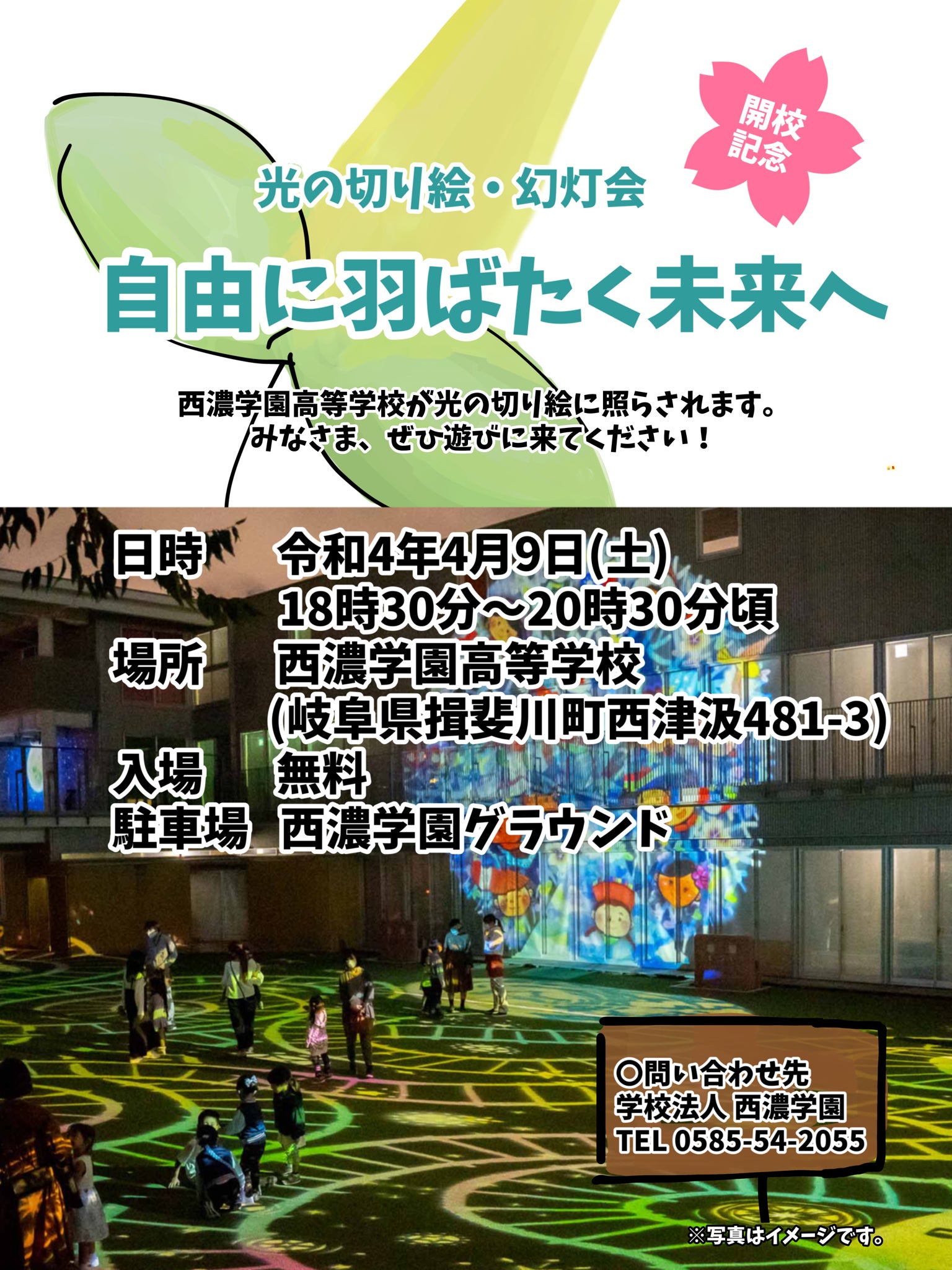 4月9日(土) に開催する光の切り絵・幻灯会「自由に羽ばたく未来へ」のチラシが出来ました。このチラシは授業の合間、休み時間を使って、生徒が作ってくれたものです。当日は校舎やグラウンド、神社に光の切り絵が投影されます。教室の中でも「光の切り絵ミニシアター」、「学園紹介VTR」をお楽しみいただけます。さらに学園を応援してくださっている地域のみなさま、幼児園の子どもたち、学園の生徒が作った紙袋ランタンで学校全体を飾ります。みなさま、ぜひ遊びに来てくださいね!  ※写真はイメージです。