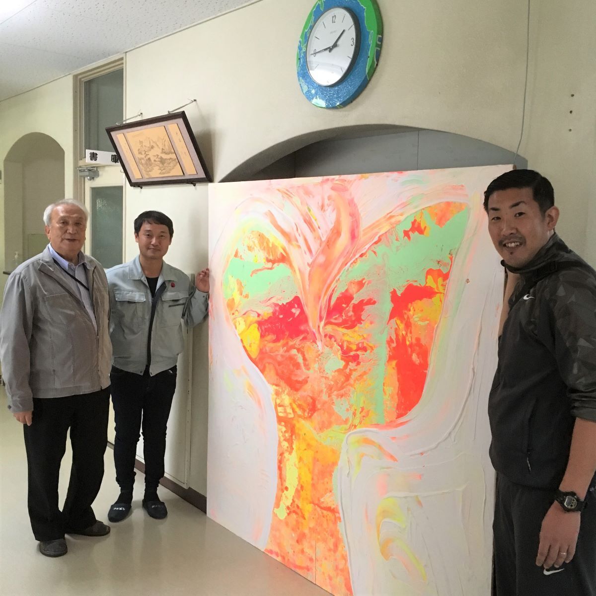 双葉プロジェクトの絵が完成!11月1日の大安の日、画家の土井田一将さんと一緒に取り組んでいた双葉の絵が完成しました。10月中旬から約10日間、授業の合間を縫って、学園の生徒たちも参加させていただきました。アクリル絵の具を刷毛に吸わせてキャンパスに散らすという独特な手法で、生徒たちも思い思いに絵の具を飛ばしたり、流したりしていました。扇風機で乾かしたキャンパスの上にさらに絵の具を散らして重ねていきます。この作業を何度も繰り返した結果、未来に向かって大きく羽ばたいていくような希望に満ち溢れた双葉になりました。土井田さんが絵に込めたメッセージ「時に熱く心を燃やし、時に冷静に心を静め、希望に溢れた未来へ自分を育みながら進む。情熱と冷静を行き来する間に、実は自然と希望に触れていることを表現しました。当たり前に過ぎ去る中にこそ、見失いやすい大切なことがあります。一人ひとりにある希望や身近な大切なものに目を向けるきっかけとなれば幸いです。」絵の具をキャンパスに飛ばす。仕上げは白色のアクリル絵の具を手のひらで伸ばす。