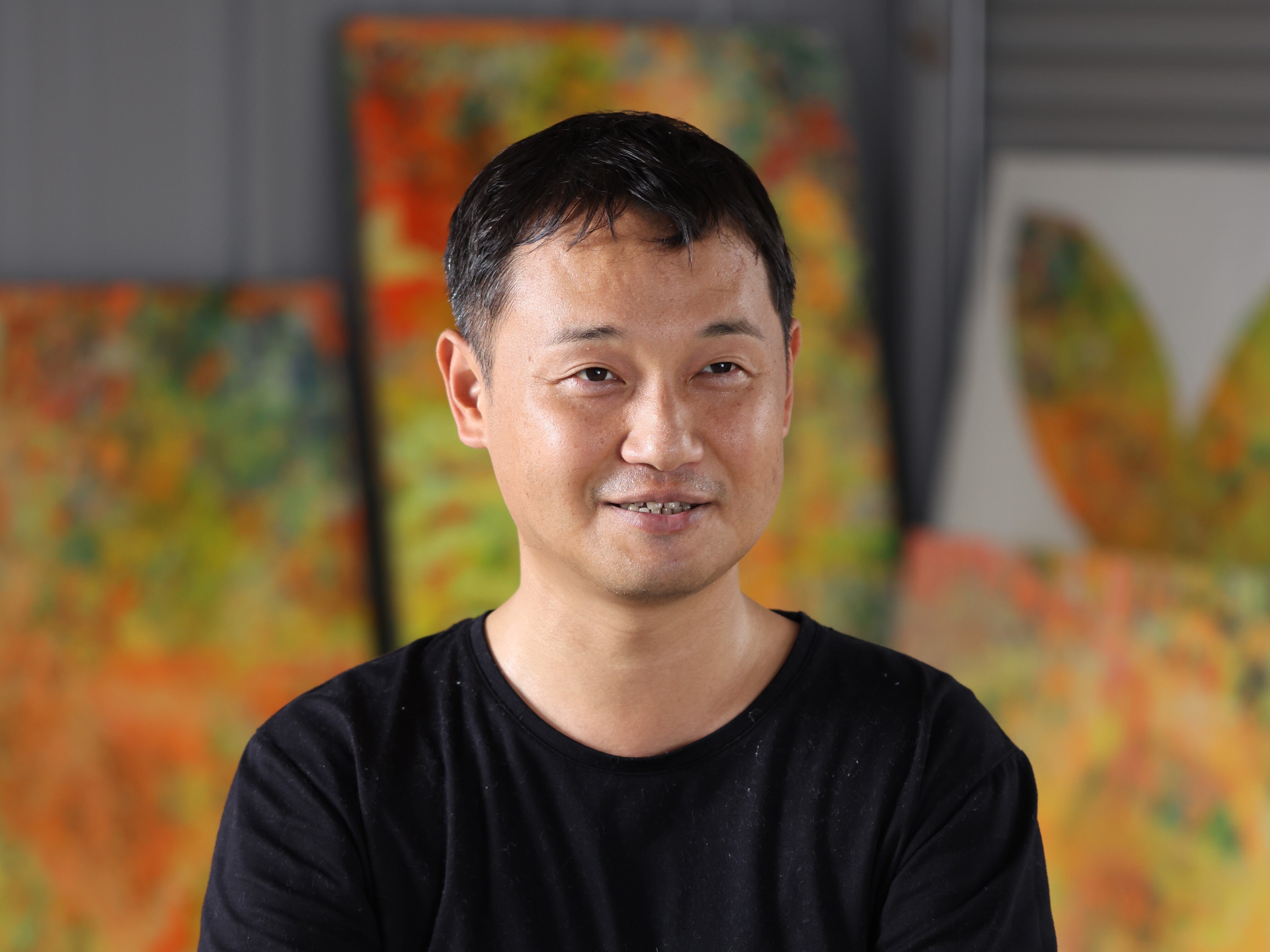 土井田一将(といだかずまさ)さん。岐阜県安八郡輪之内町出身。内外装仕上げ工事業の太陽建材に勤務しながら、「双葉」をテーマにした絵を描いている。