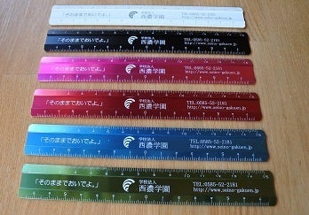 岐阜県垂井町の安田金属工業株式会社さん、滋賀県大津市のWorks MATSUSHITAさんの協力で、西濃学園のオリジナルロゴ入りスケールが完成しました。素材はアルミニウムで約11gの軽量タイプ。線を引いた時にガタガタしない寸止め加工が施されています。目盛りやロゴはレーザー彫刻のため、消えることはありません。色は全8色(レッド・ピンク・ブルー・グリーン・シルバー・ホワイト・ブラック艶あり・ブラック艶なし)