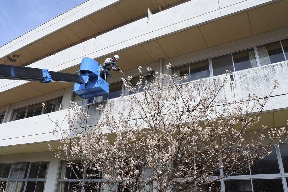 2022/03/30 14:23学園の桜も咲き始め、すっかり春らしくなってきました。グラウンドに山のように積もっていた雪もなくなったので、3月末から揖斐川町の株式会社ヤマモトさんに外壁の洗浄作業をお願いしています。ホコリやチリなどによって黒ずんでいた外壁が、高圧洗浄機によってみるみる白くなっていくのを見るのは気持ちがいいものですね。開校式&入学式まであと一週間。皆さまのおかげで、新入生の皆さんをピカピカの校舎で迎えることができそうです。ありがとうございます!クレーン車に乗りながらの洗浄作業は大変。 株式会社ヤマモトの皆さま、ありがとうございます! もっと見る
