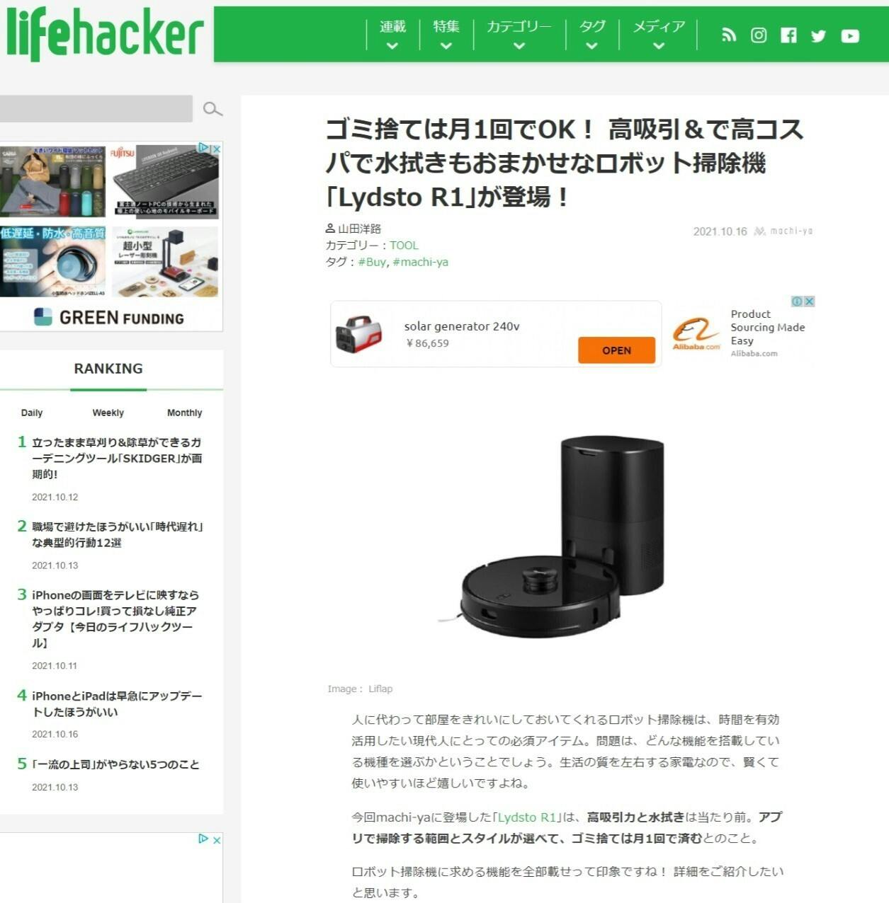 10月16日に、Lydsto R1 がlifehackerにて紹介されました。