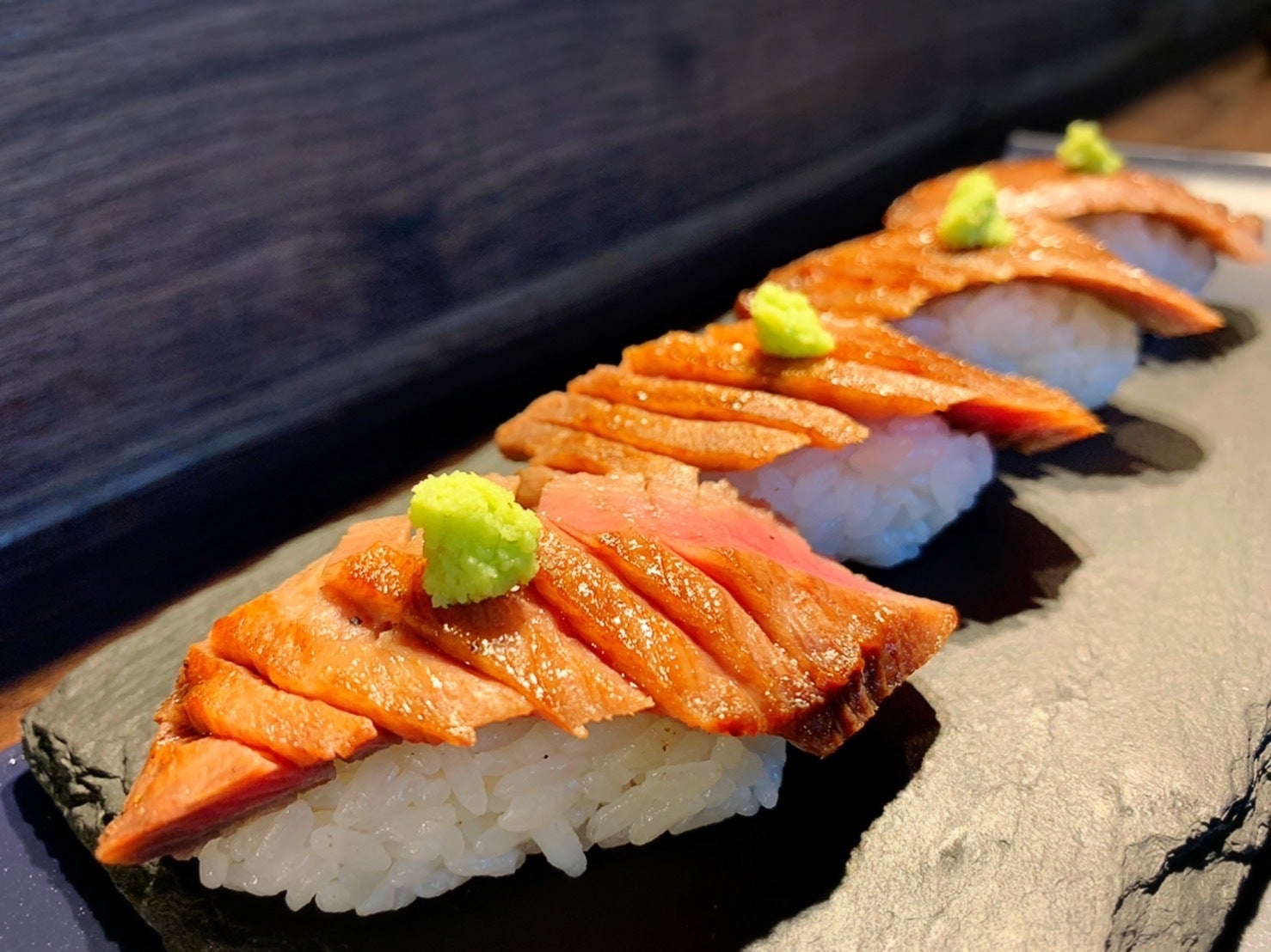 盤面を大きくしてカット。お好みでわさび醤油でお召し上がりください。本格的な肉寿司となります。