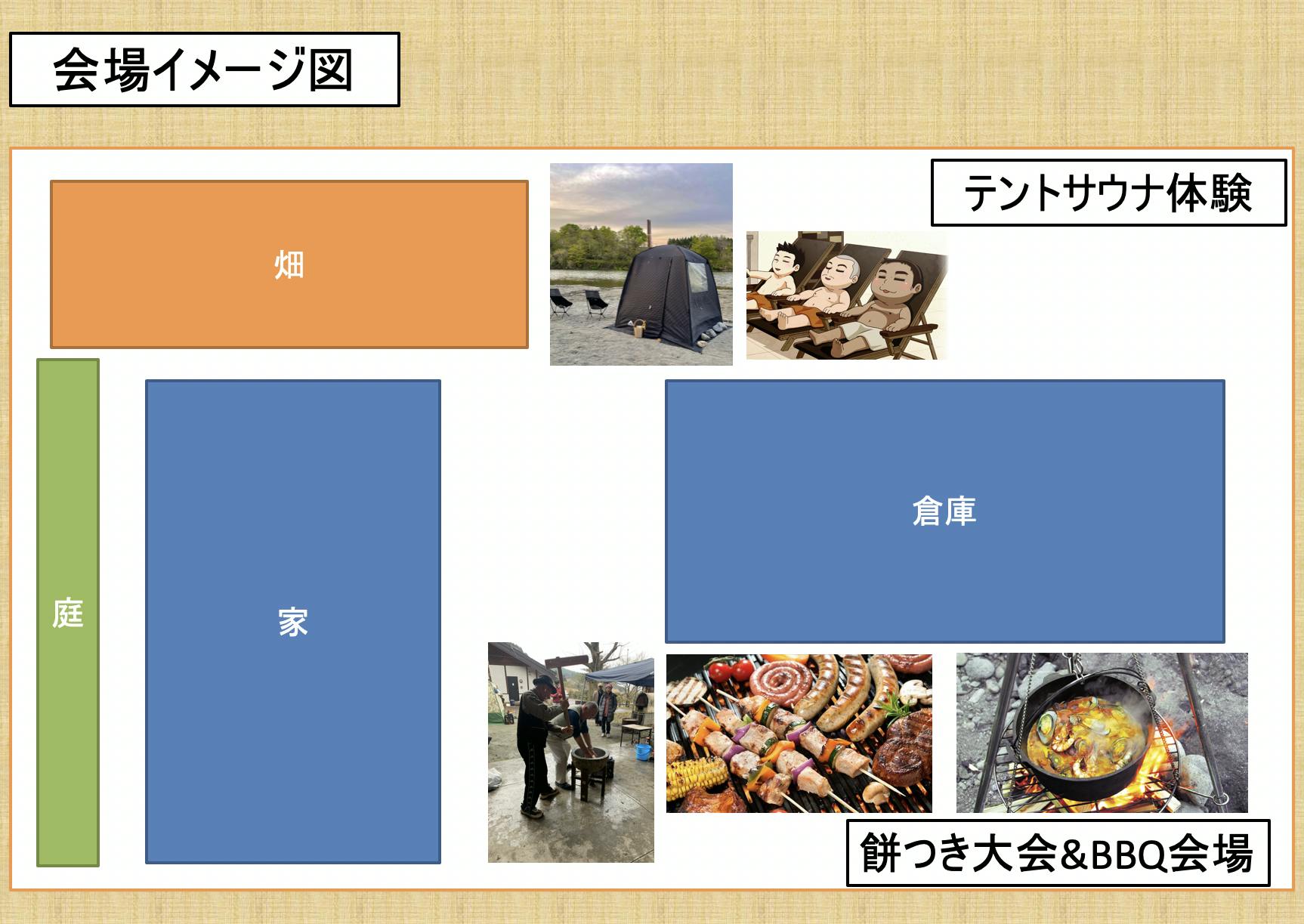 また、敷地内に畑を開墾しているので、イベント参加者の皆さんと一緒に、畑にできた野菜を収穫し、その採れたて新鮮野菜をBBQやお雑煮にして振る舞おうと思っています。サウナの後の「サ飯(サウナ後のご飯)」につきたてのお餅と採れたて野菜のBBQで、最高の「サ活(サウナ活動)」を提供します!