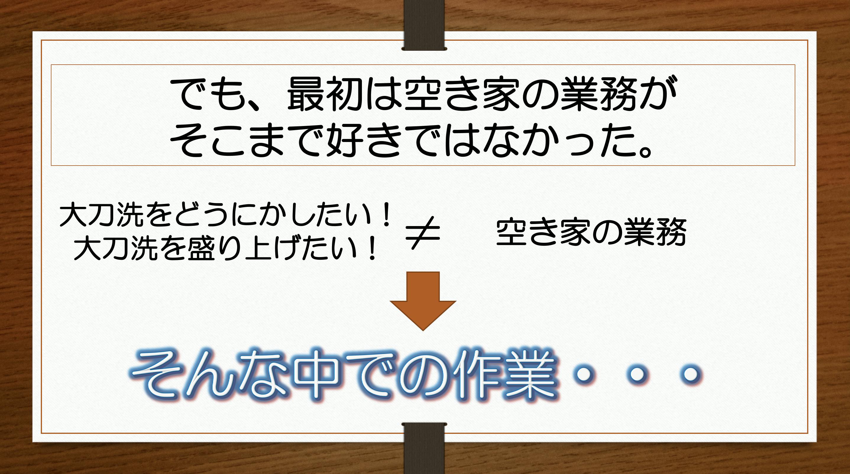 逆に燃えて、「やったるぞ」という想いで、取り組んだ仕事の主な業務は、空き家がどこにあるのか調べる掘り起こしの作業であったり、空き家バンク制度を周知して、登録物件を増やしたりする仕事で、私の思い描いていたものと少し違っていました。町のためになるイベントをしたり、香港との繋がりを活かした業務をしたりなど、もっとこう、新しい風を吹かせる的な業務を考えていたので、空き家の業務は、今のように「めちゃくちゃ楽しい!」というわけではありませんでした…
