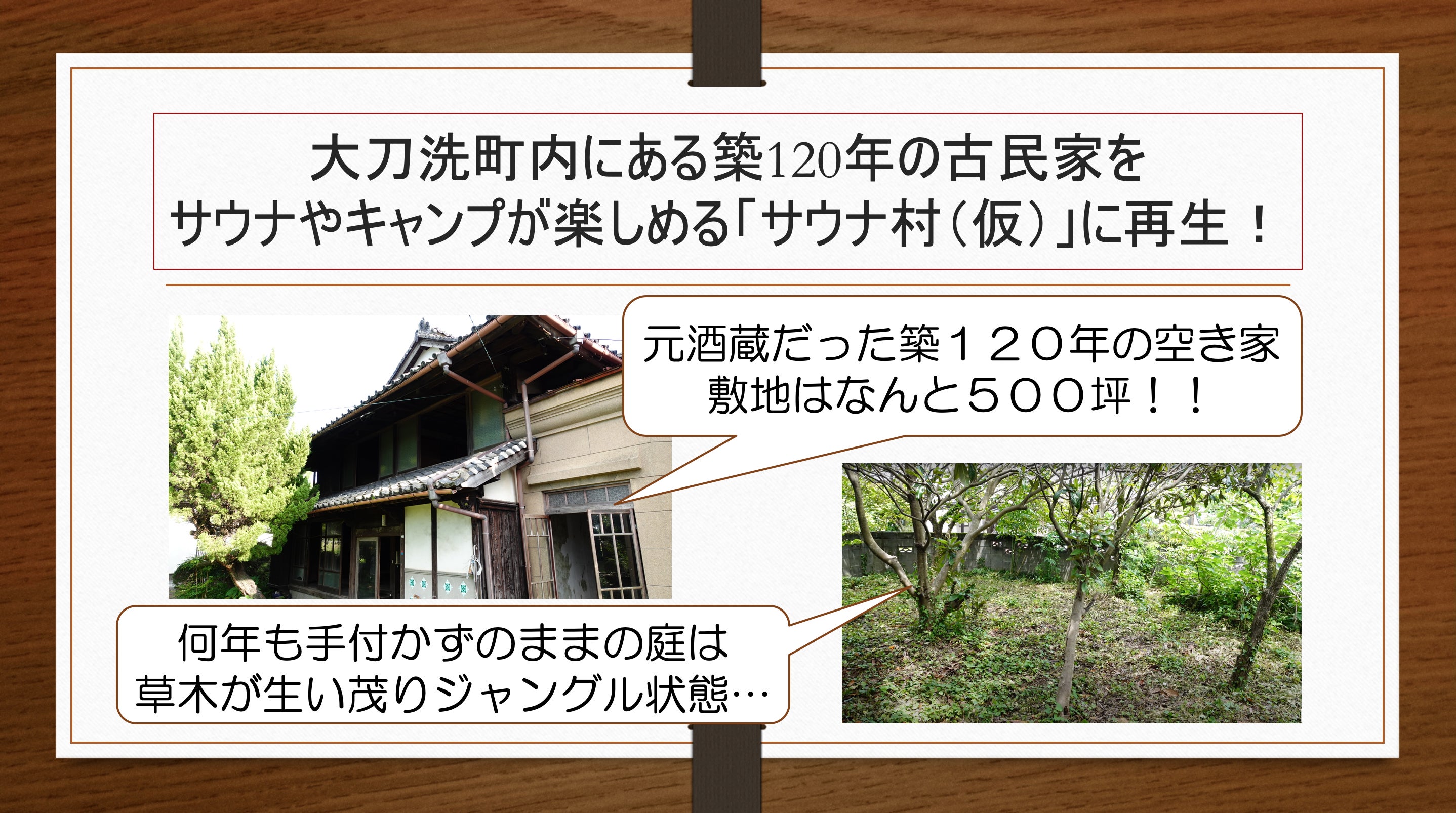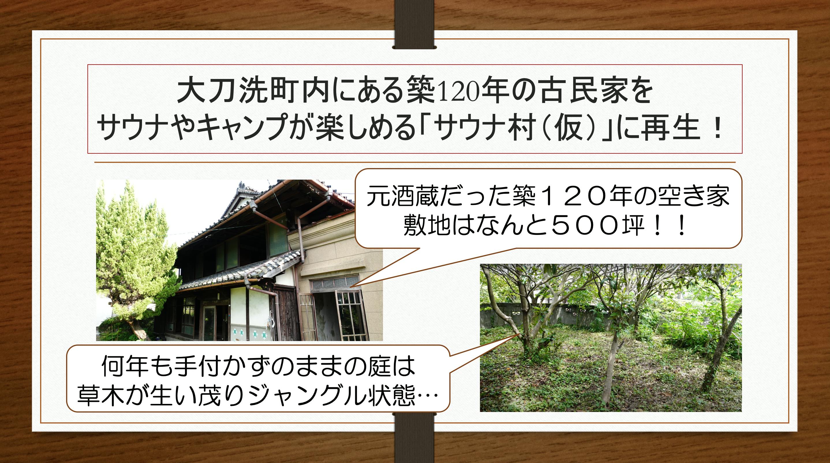プロジェクトの内容は、「空き家になった築120年の古民家を、サウナやキャンプなどで遊べる場所に再生する!」というものです。