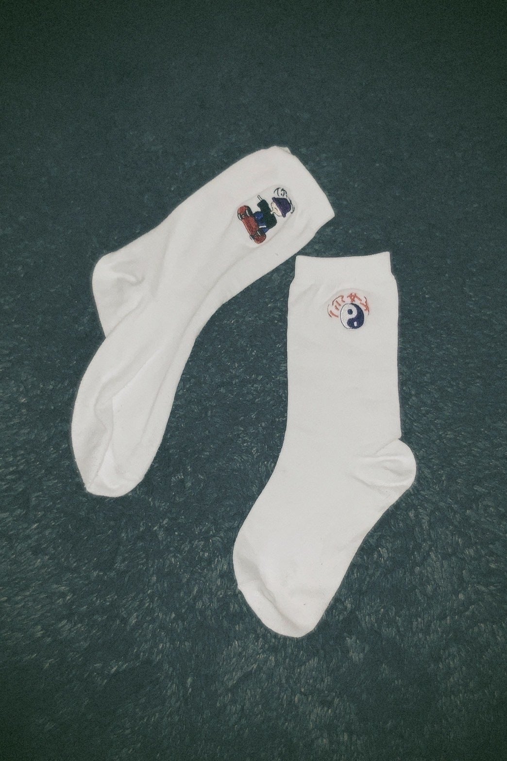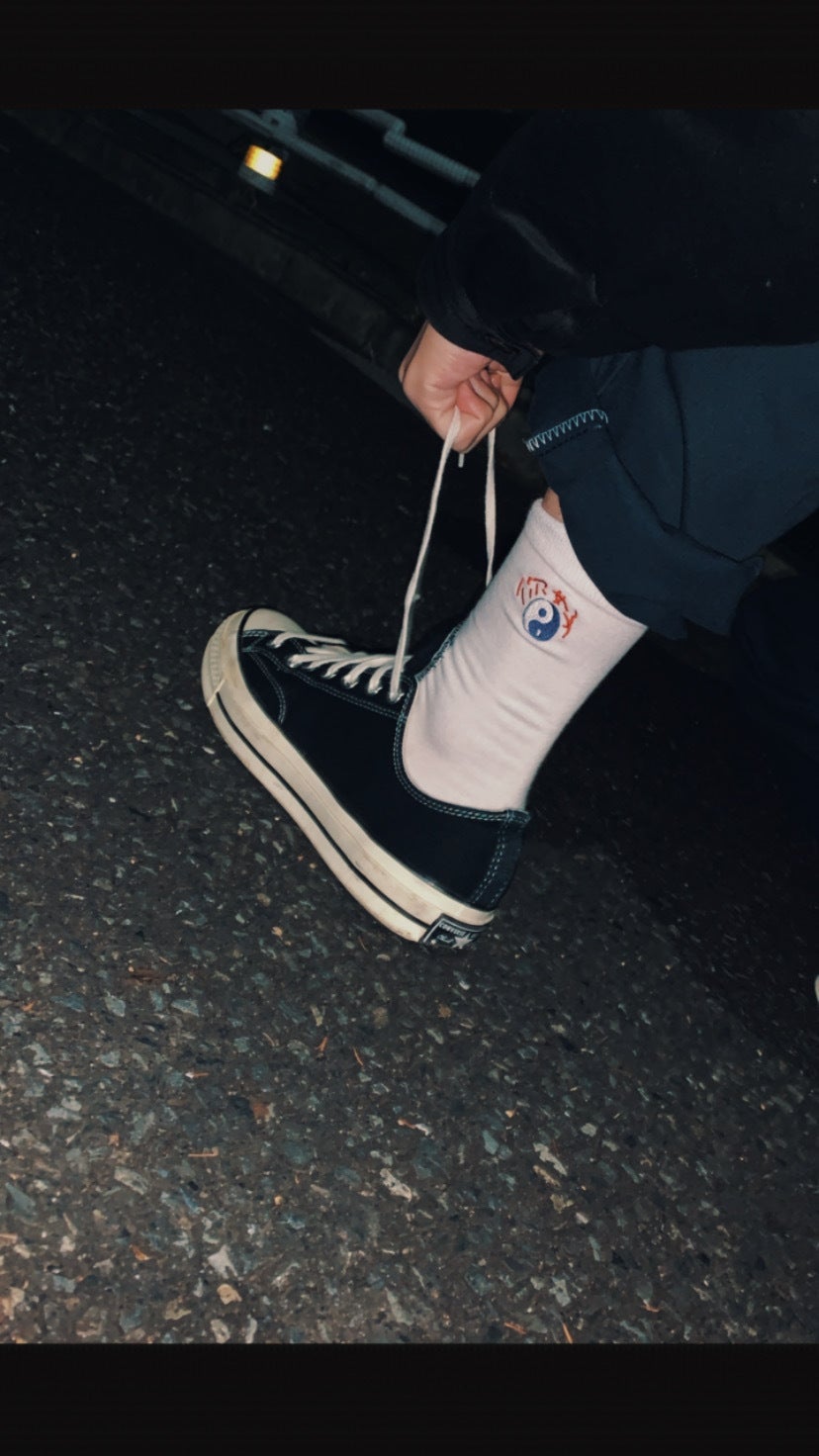 靴下の一つのマークである太陰太極図は森羅万象、全てのものが陰と陽の要素によって成り立っているという考え方から来ています。