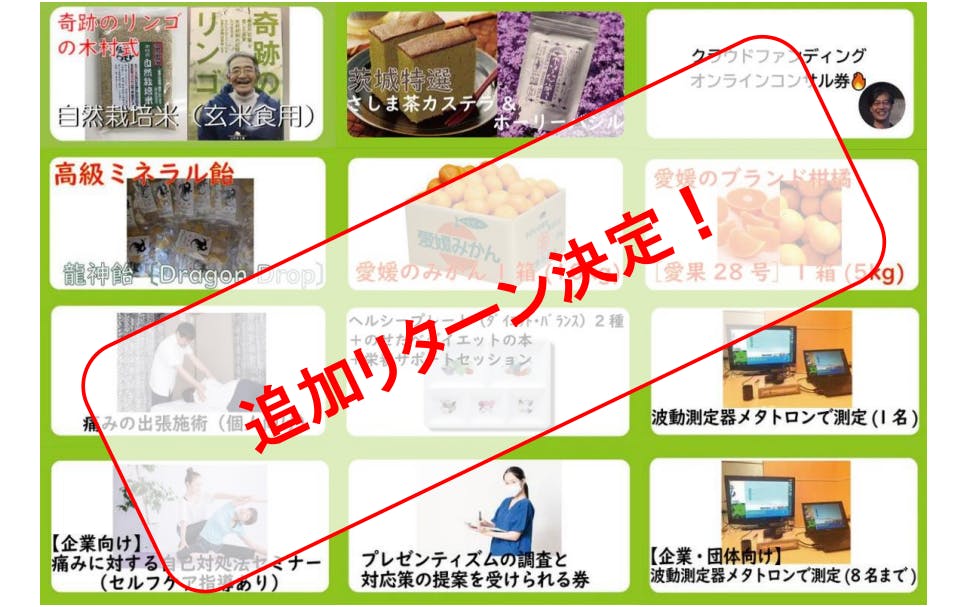 愛媛のみかん・茨城のさしま茶カステラ・木村式の自然栽培米など、こだわりの特産品から、クラウドファンディングのオンラインコンサル券や波動測定器メタトロンでの測定を受けられる券など、ユニークなリターンがそろっていますので、ぜひ一つずつご覧ください♪(緑色の縁が目印です!)
