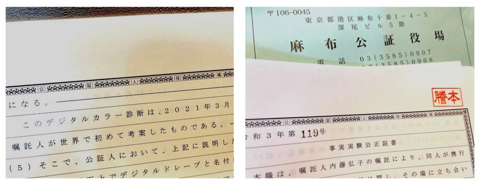 デジタルカラー診断:2021年7月14日、東京麻布公証役場にて、【令和3年 第119号 事実実験公正証書】 が作成されています。その後、2022年2月10日に特許を申請しました。 【特許出願番号:特願2022-19487】