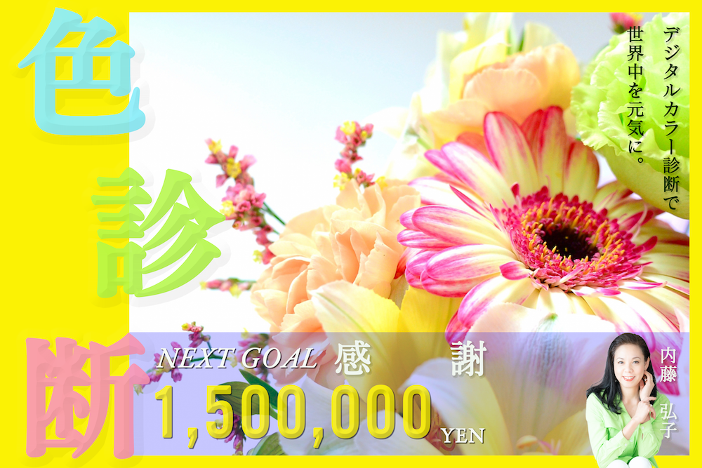 【デジタルカラー診断で、世界中の人を笑顔で元気にパワフルにする!】クラウドファウンディングにご支援いただきました皆様へ皆様のご支援のおかげで、デジタルカラー診断のクラウドファウンディング額が、225%を達成しました! どうもありがとうございます!!本日 1,500,000円のサードゴールを設定いたしましたので、ご報告させていただきます。これだけたくさんの方々に温かいご支援をいただきましたこと、本当に有難い=有り得ない、ことだと思っております。支援していただくということは、お金をいただくだけではなく、お気持ちやお心をかけていただくということです。たくさんの方が、このプロジェクトに対して「頑張って」「面白そう」「よくやってるな」「診断して欲しいな」「商品欲しいな」「広がるといいね」「応援してるよ」「興味あるよ」「協力するよ」というお気持ちを持ってくださったこと、これはもう有難い=有り得ないことです!こんなミラクルな、有り得ないことをしてくださった皆様のお気持ちに応えるには、私がこの世界初のデジタルカラー診断を使って、「色で世界をハッピーに!」を体現していくことしかないと思っています。4月29日の終了まで、皆様が応援してくださったお気持ちをガソリンとして、まだまだ走ってまいりますので、どうぞ引き続きよろしくお願いいたします。オフィス・プンティ内藤弘子