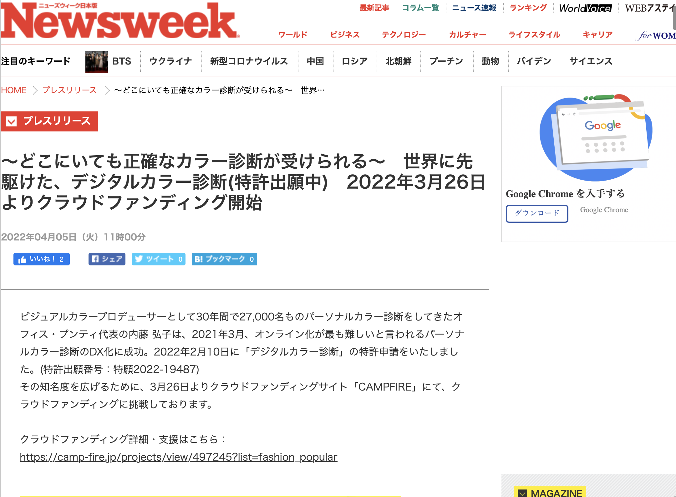 「デジタルカラー診断で世界中の人を笑顔で元気にパワフルにする!」にご支援いただきました皆様このクラファンの記事が、朝日新聞デジタルマガジン&、ニューズウィーク日本版、NEWS PICKSなど、錚々たるメディア、34社に掲載されました。自分が開発したこの新しい技術に心血を注いで、これから協会をつくり、後進を育て、世界中に広めていきたいと思っています。この技術で、世界中の人を笑顔にしたい!本気でそう思っています。クラファンを始める前は、「こんな何者でもない自分がクラファンなんかやっても、支援なんてされないんじゃないか?」と、不安でした。でも、こうしてクラファンで皆様にたくさんのご支援をいただき、メディアに掲載させていただいているということは、きっと世の中のお役に立てるものとして期待されているのだと思うのです。その皆様の期待や応援があればこそ、これからもこの事業を進めていことができるのです。皆様の応援というガソリンで、これからも走り続けていきます。心から感謝を込めて。ありがとうございます。朝日新聞デジタルマガジン&ニューズウィーク日本版NEWS PICKS