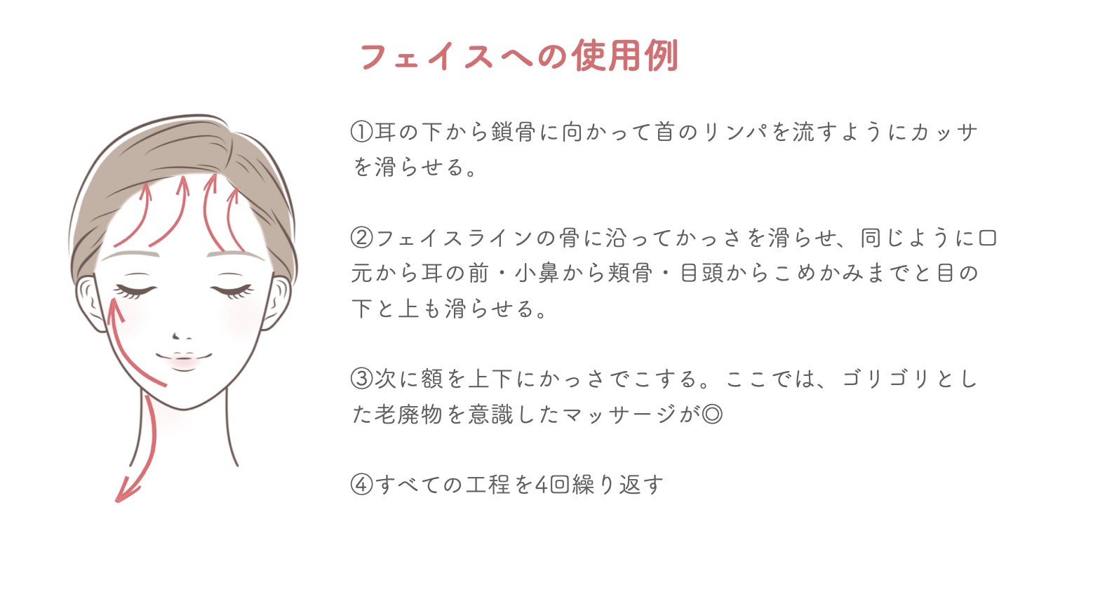 「カッサ」は元々、中国の民間療法「刮痧(かっさ)療法」からきており、「刮(かつ)」は“削る”、「痧(さ)」は“滞っている血液”を意味しています。これはカッサプレートという独特な形の板を使って、肌の上からリンパなどを刺激し、体内の毒素を肌表面に押し出す療法で、カッサを使うと、手で直にマッサージするよりも力を入れずに圧をかけられるので、腕が疲れにくく、セルフケアしやすいのが特徴です。