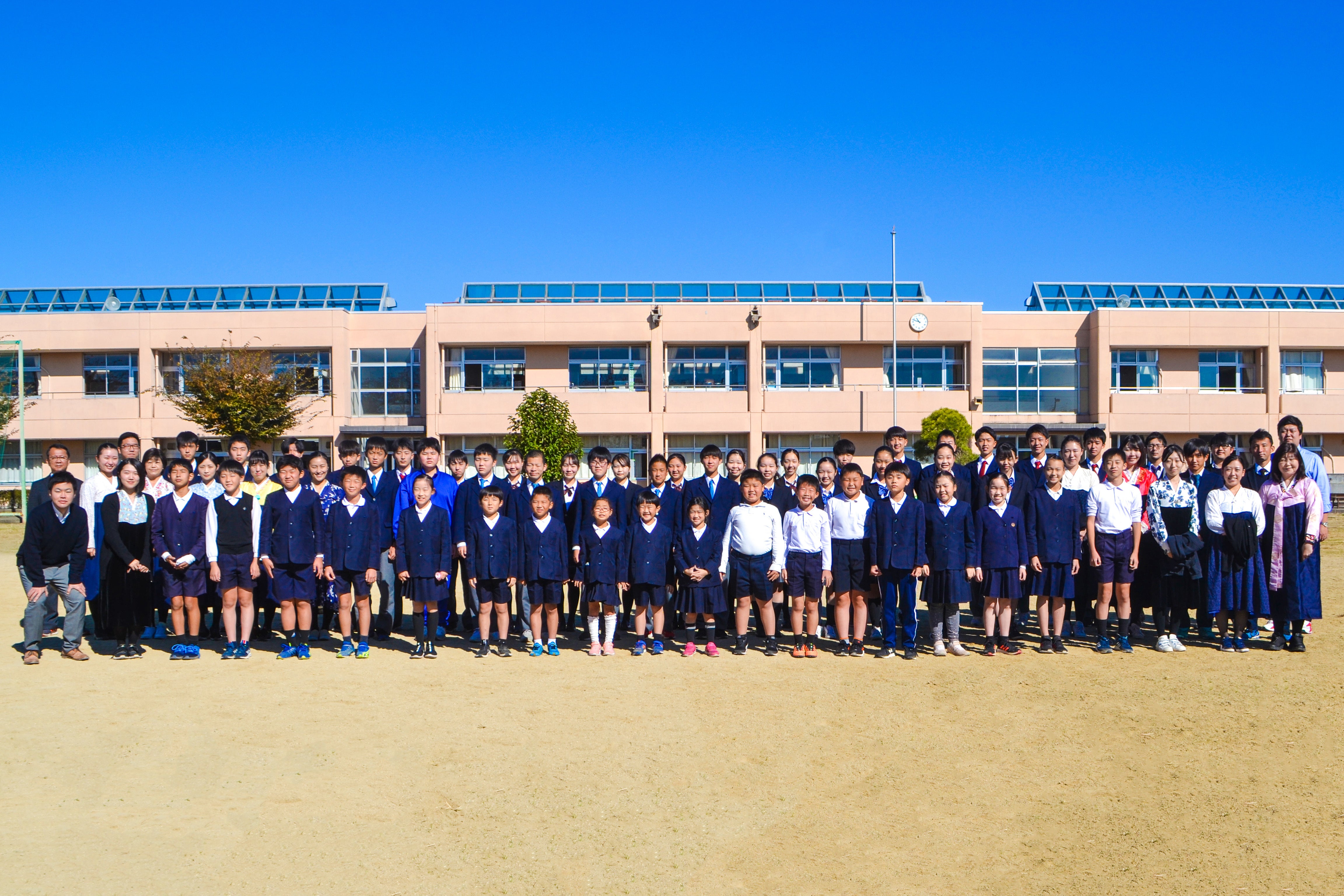 休み時間を利用して、土のグラウンドでは最後になる記念撮影を全校生徒と先生たちで撮りました!