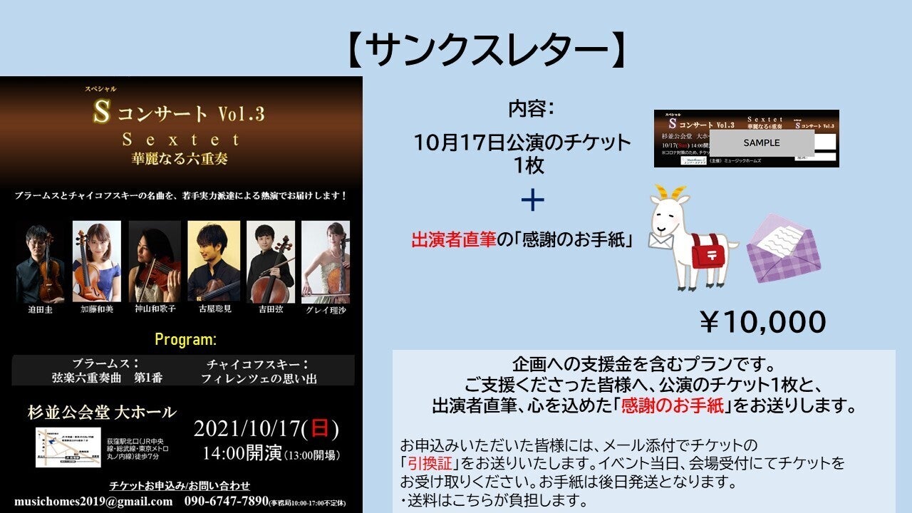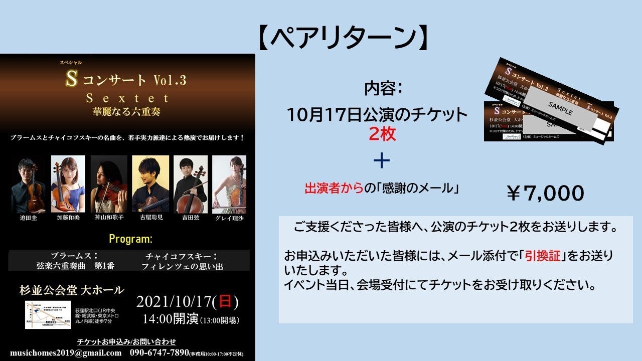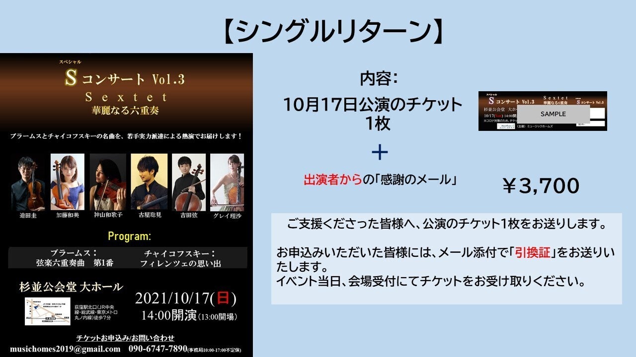 最も基本的な、10月公演のチケット+演奏者からの感謝メッセージのプランです。ペアだと少しお得に!