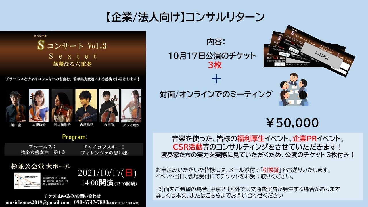 企画への支援金を含むプランとなります。 音楽を使った皆様の福利厚生イベント、企業PRイベント、CSR活動などのコンサルティングをさせていただきます。所属する演奏者たちの実力や人柄をご覧いただけるよう、10月公演のチケット3枚付きです!