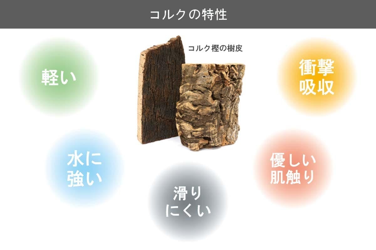 「軽い」「水に強い」「クッション性」などのコルクの特性はそのままで、表面