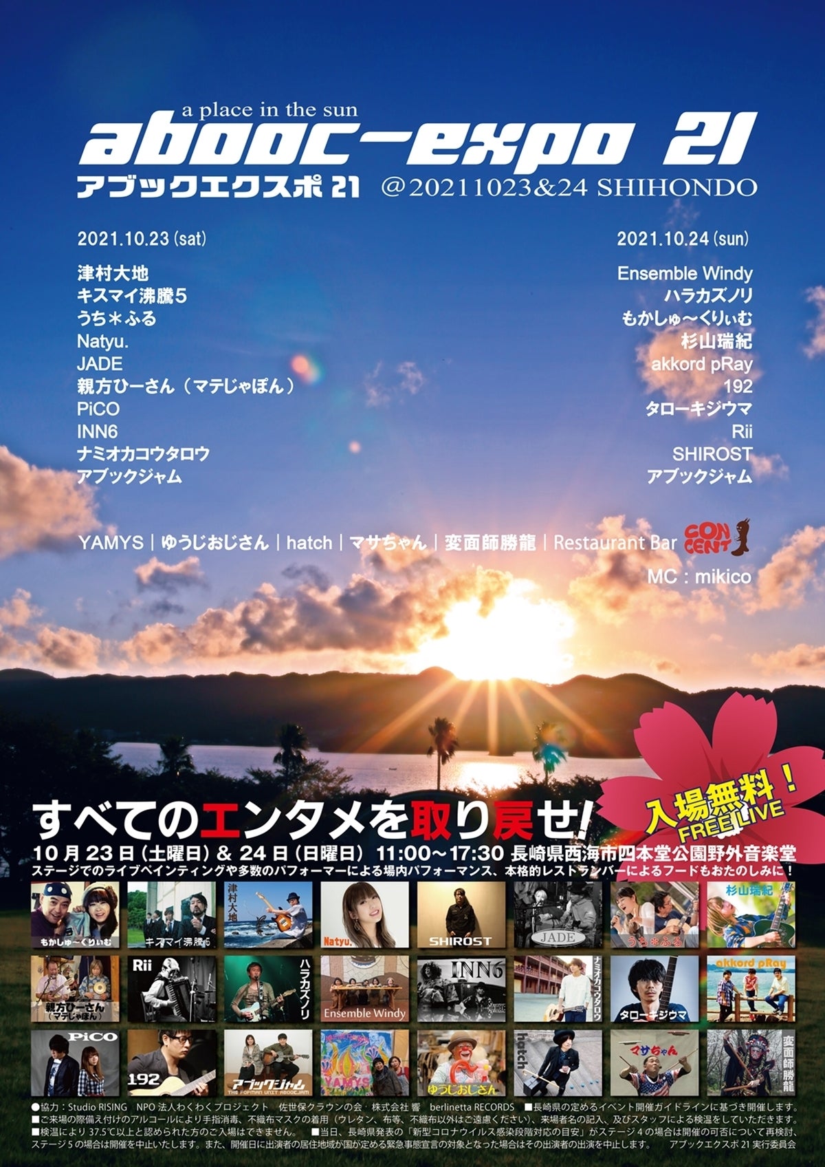 当イベントは長崎県の定めるイベント開催ガイドラインに基づき開催します。 当日、長崎県発表の「新型コロナウイルス感染段階対応の目安」がステージ4の場合は開催の可否について再検討、ステージ5の場合は開催を中止いたします。また、開催日に出演者の居住地域が国が定める緊急事態宣言の対象となった場合はその出演者の出演を中止します。
