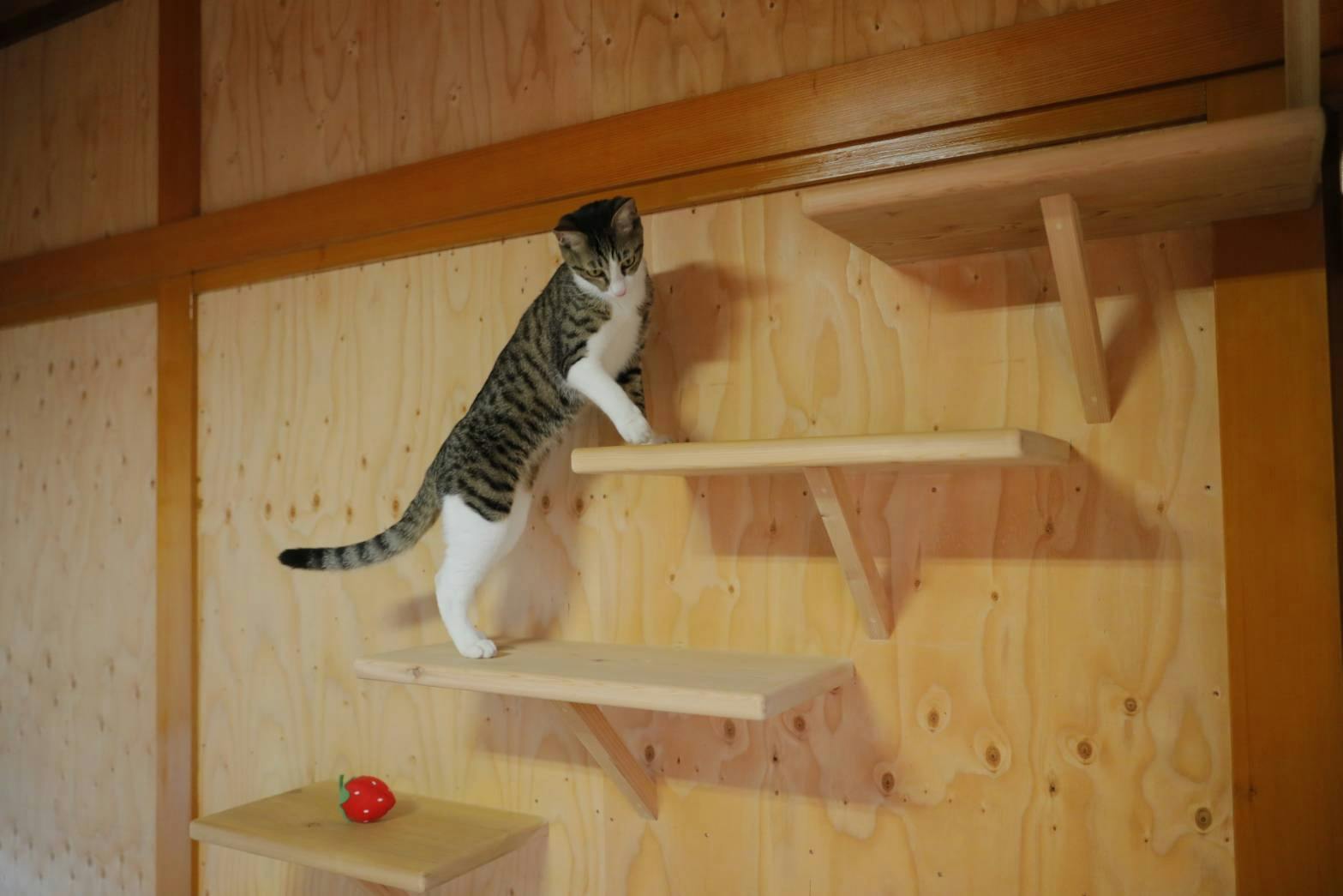 空き家だった場所の掃除や片づけをし、猫達がのびのびと過ごせるように簡単なリフォームをして、壁にキャットウォークを作りました。